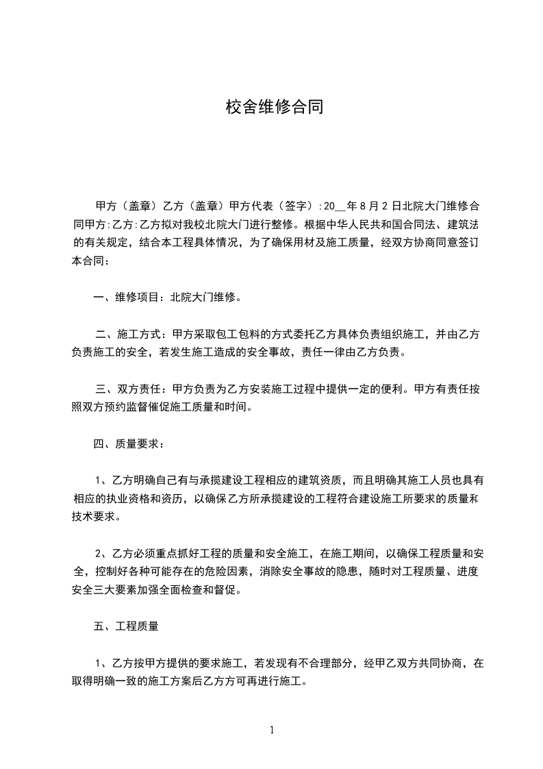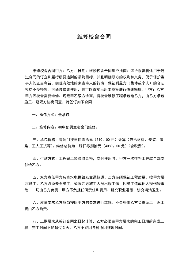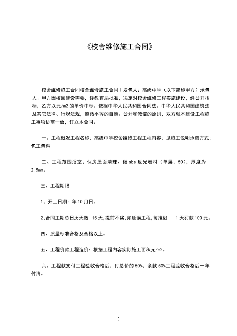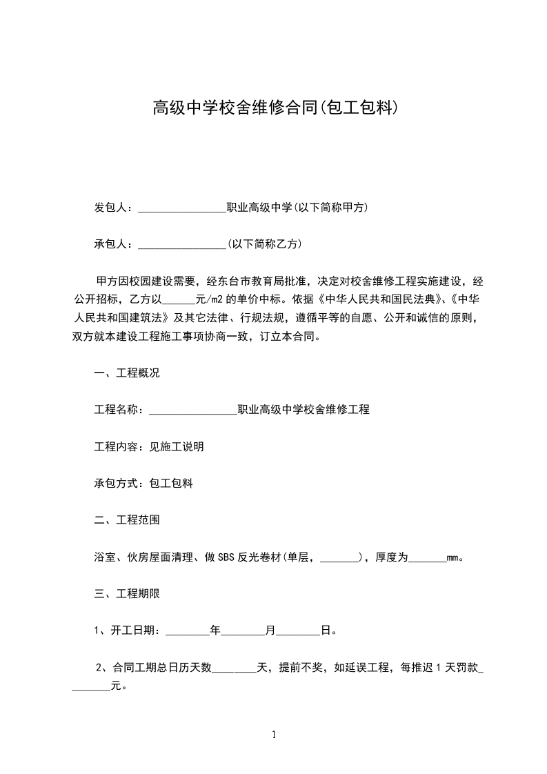 甲方因校园建设需要,经东台市教育局批准,决定对校舍维修工程实施建设,经公开招标,乙方以______元/m2的单价中标。依据《中华人民共和国民法典》、《中华人民共和国建筑法》及其它法律、行规法规,遵循平等的自愿、公开和诚信的原则,双方就本建设工程施工事项协商一致,订立本合同。