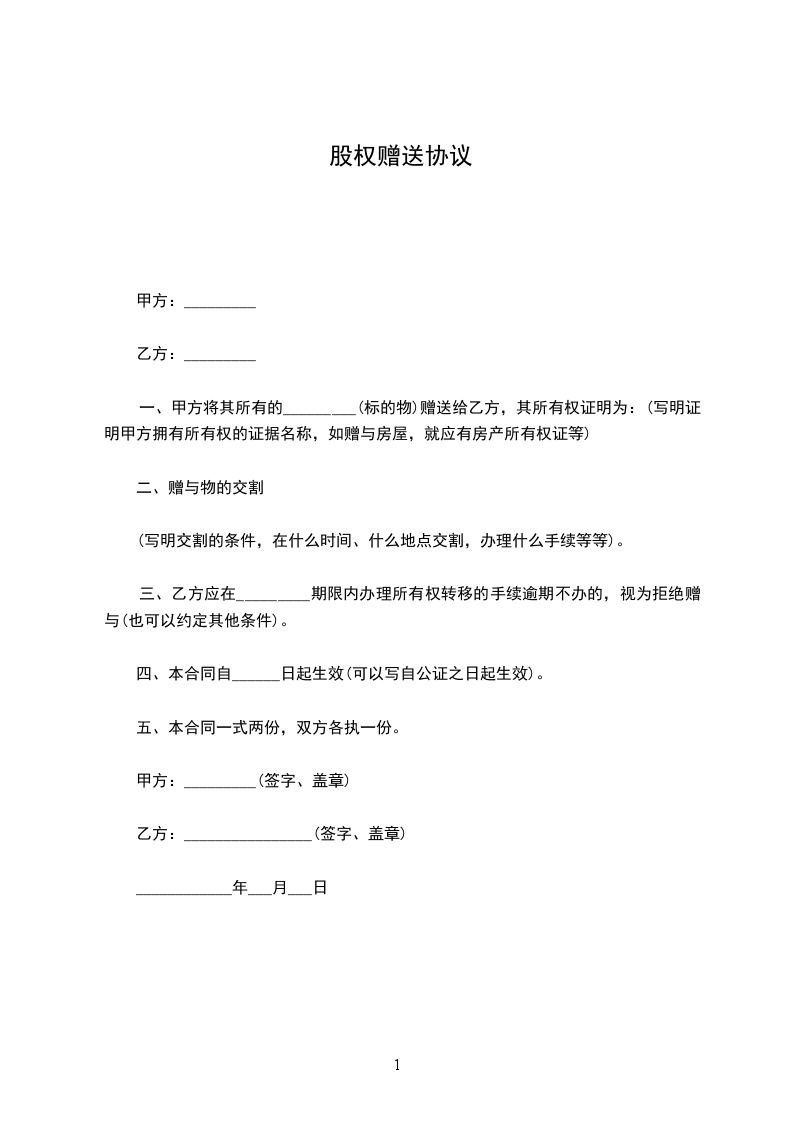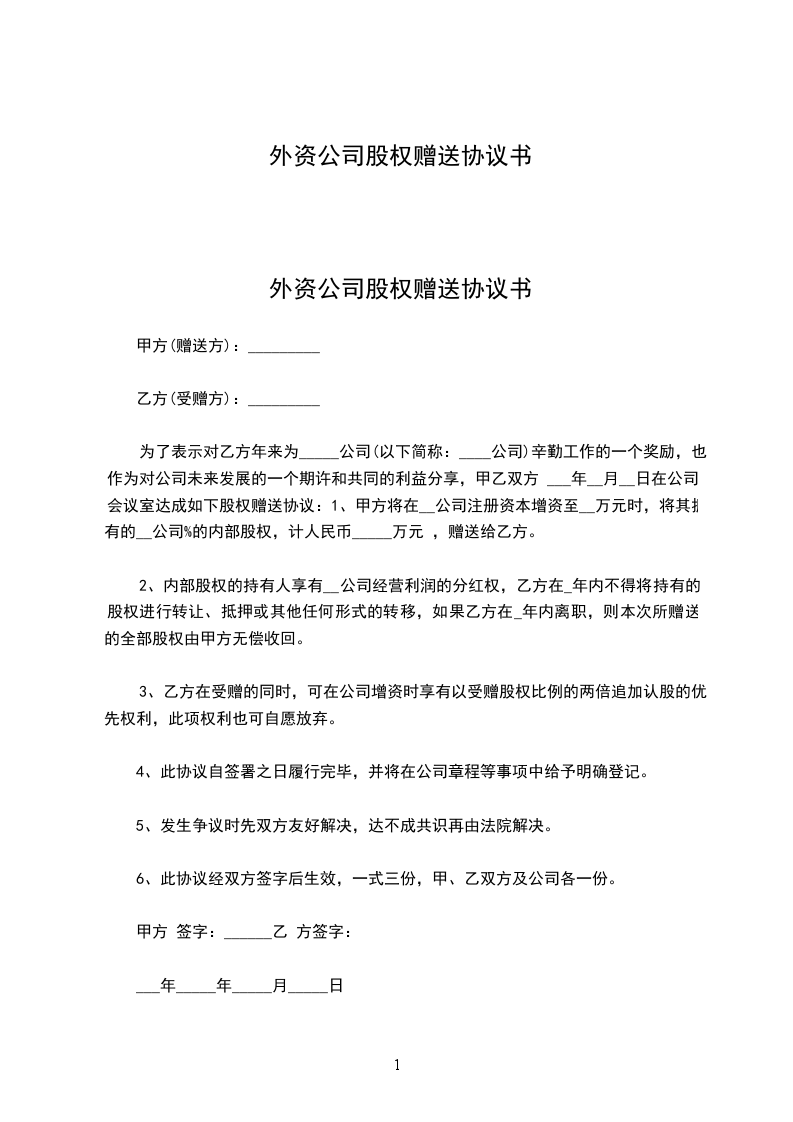 二、甲方作为某公司的股东之一,拥有某公司 ______%的股权,现根据《公司章程》及《股东会决议》,甲方同意将______ %的股权赠与乙方,乙方愿意受赠股权并参与公司的经营管理。