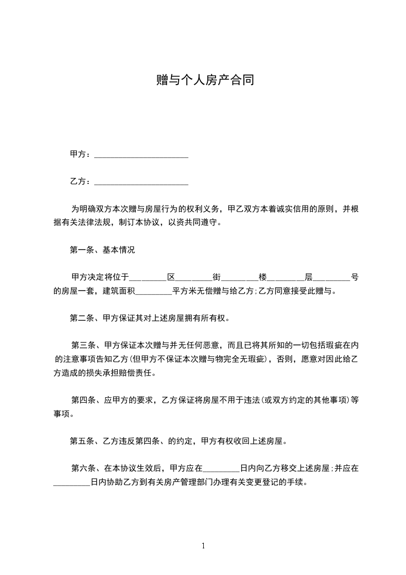 甲方决定将位于_________区_________街_________楼_________层_________号的房屋一套,建筑面积_________平方米无偿赠与给乙方;乙方同意接受此赠与。