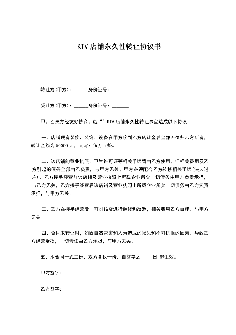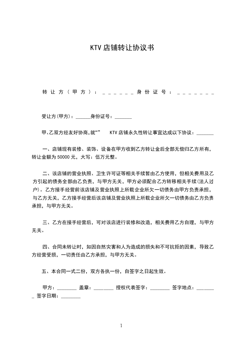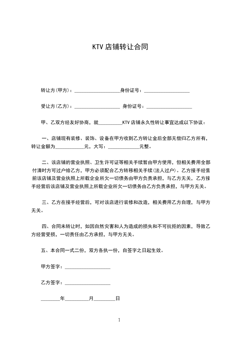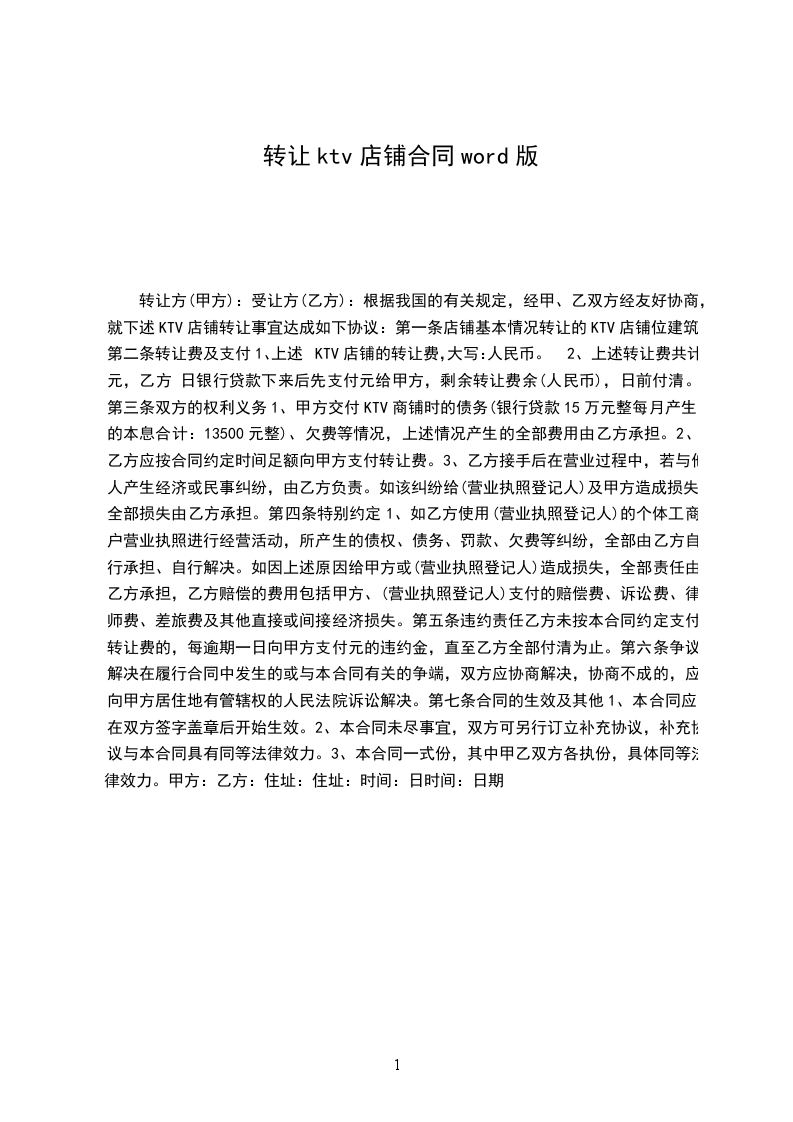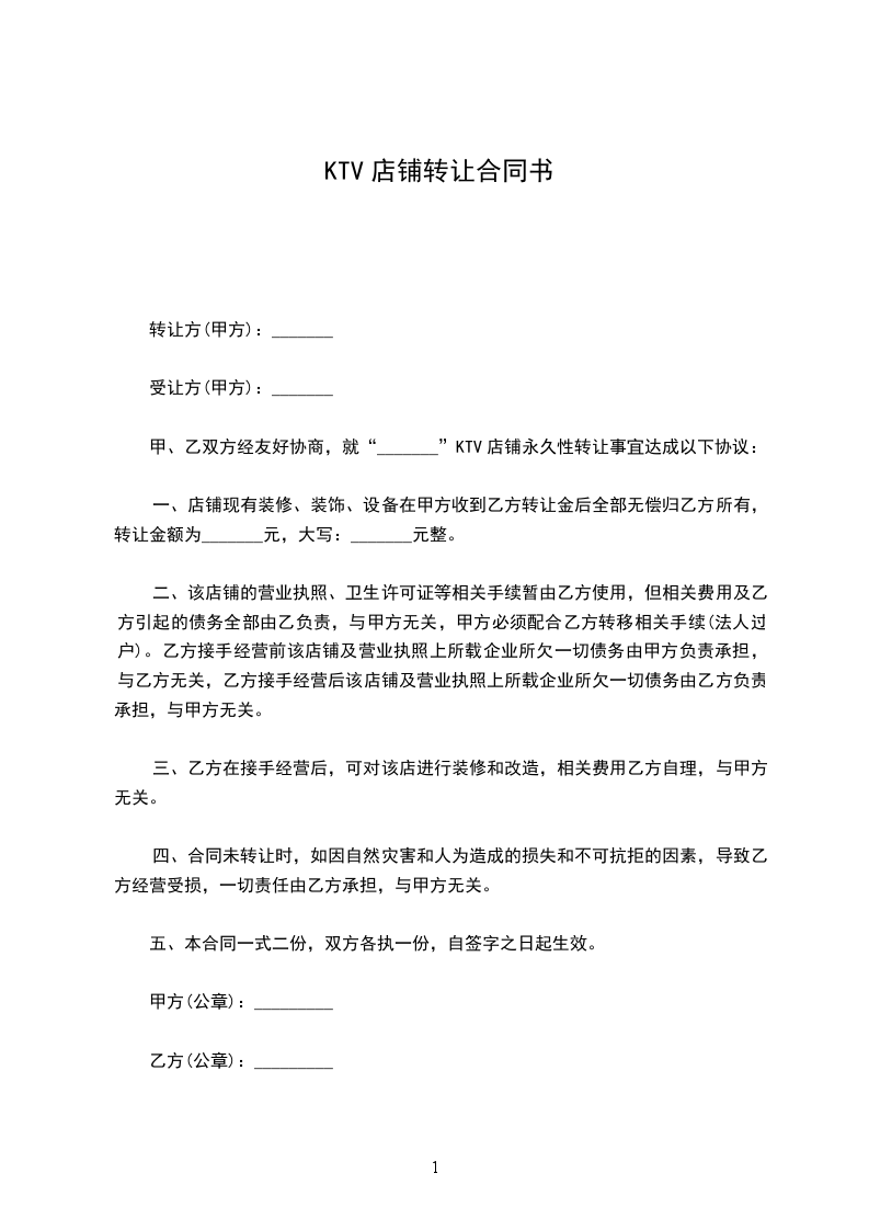 第一条:甲方必须在乙方付清相关转让费用时( __________日前)将位于____________________________店面转让给乙方经营。