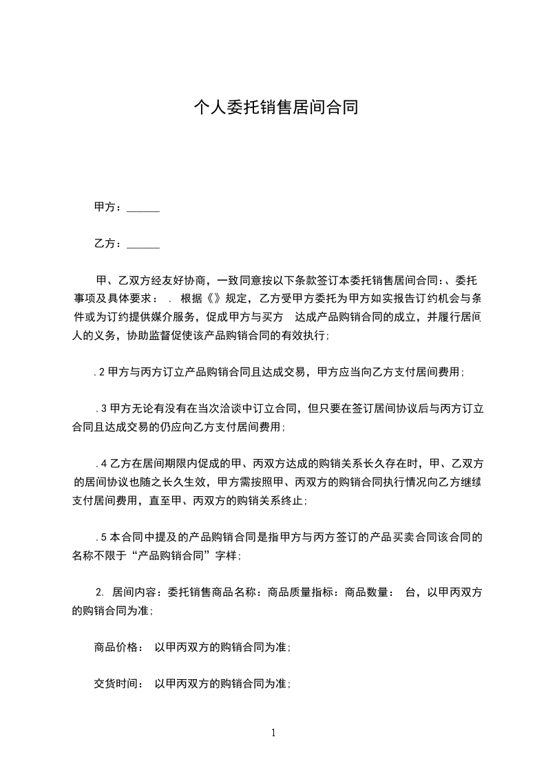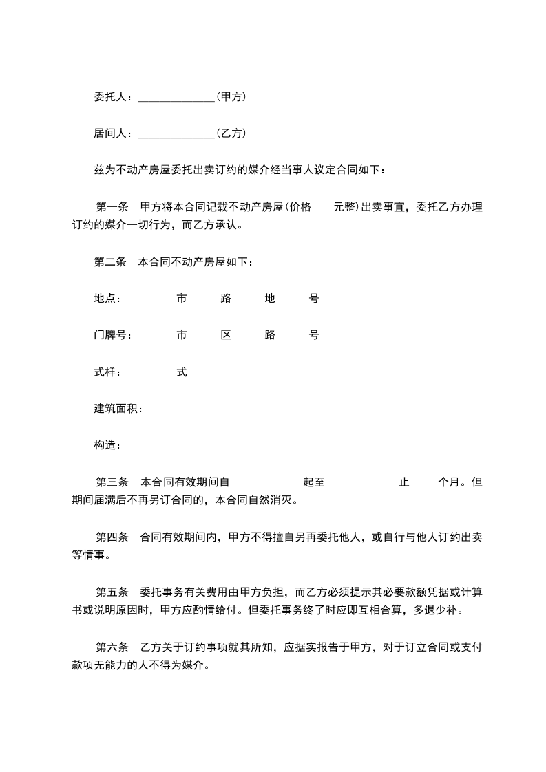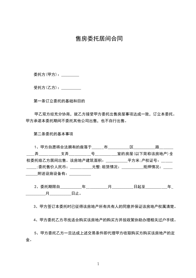 1、甲方自愿将合法拥有的座落于______市___________区___________路___________弄___________支弄___________号___________室的房屋(以下简称该房地产)全权委托给乙方居间出售。该房地产建筑面积:___________平方米;产权证号:___________;委托售价人民币:___________元整;租赁情况:___________抵押情况:___________附送设施设备有:___________