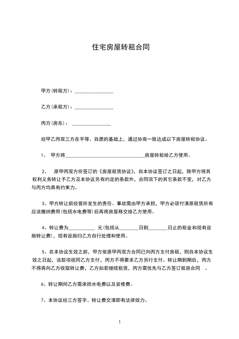经甲乙丙双三方在平等、自愿的基础上,通过协商一致达成以下房屋转租协议。