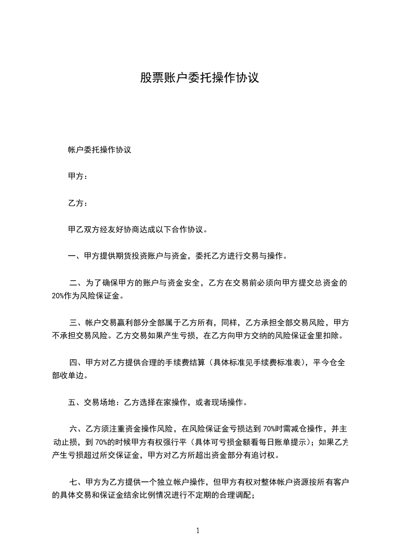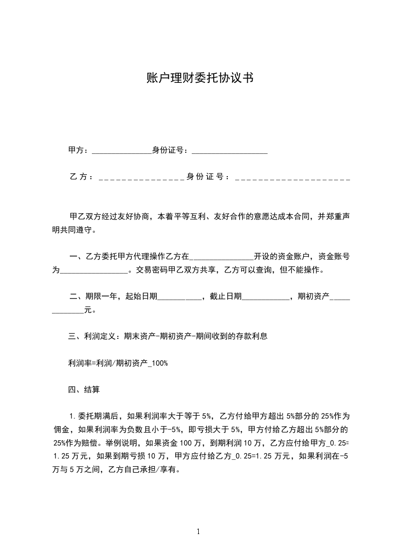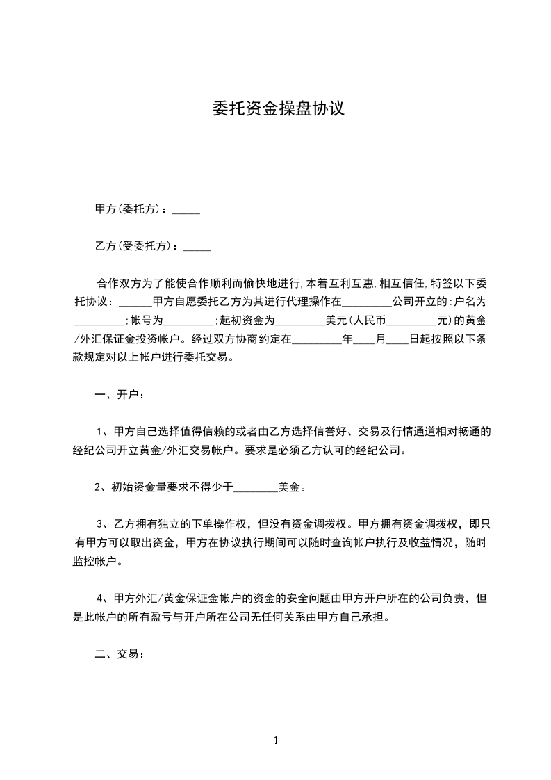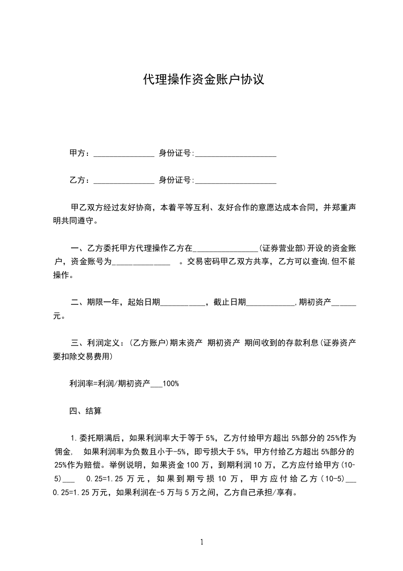 一、乙方委托甲方代理操作乙方在________________开设的资金账户,资金账号为_________________ 。交易密码甲乙双方共享,乙方可以查询,但不能操作,不得以任何形式指挥和干扰甲方操作。
