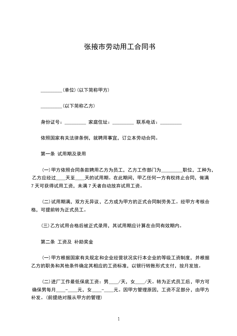 (一)甲方依照合同条款聘用乙方为员工,乙方工作部门为_________职位,工种为,乙方应经过____天至____天的试用期。在此期间,甲乙任何一方有权终止合同,做满7天可获得试用工资,未满7天者自动放弃试用工资。