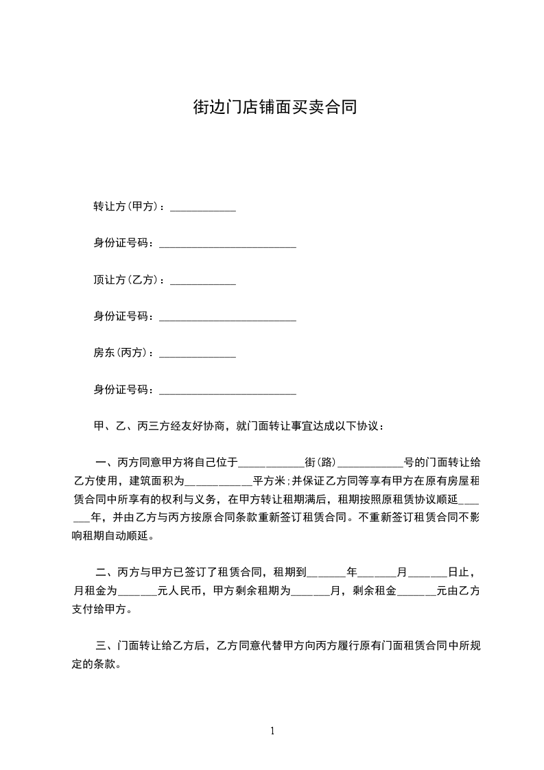 一、丙方同意甲方将自己位于____________街(路)____________号的门面转让给乙方使用,建筑面积为____________平方米;并保证乙方同等享有甲方在原有房屋租赁合同中所享有的权利与义务,在甲方转让租期满后,租期按照原租赁协议顺延_______年,并由乙方与丙方按原合同条款重新签订租赁合同。不重新签订租赁合同不影响租期自动顺延。