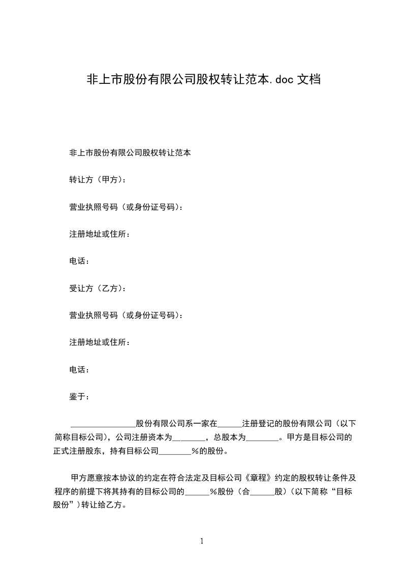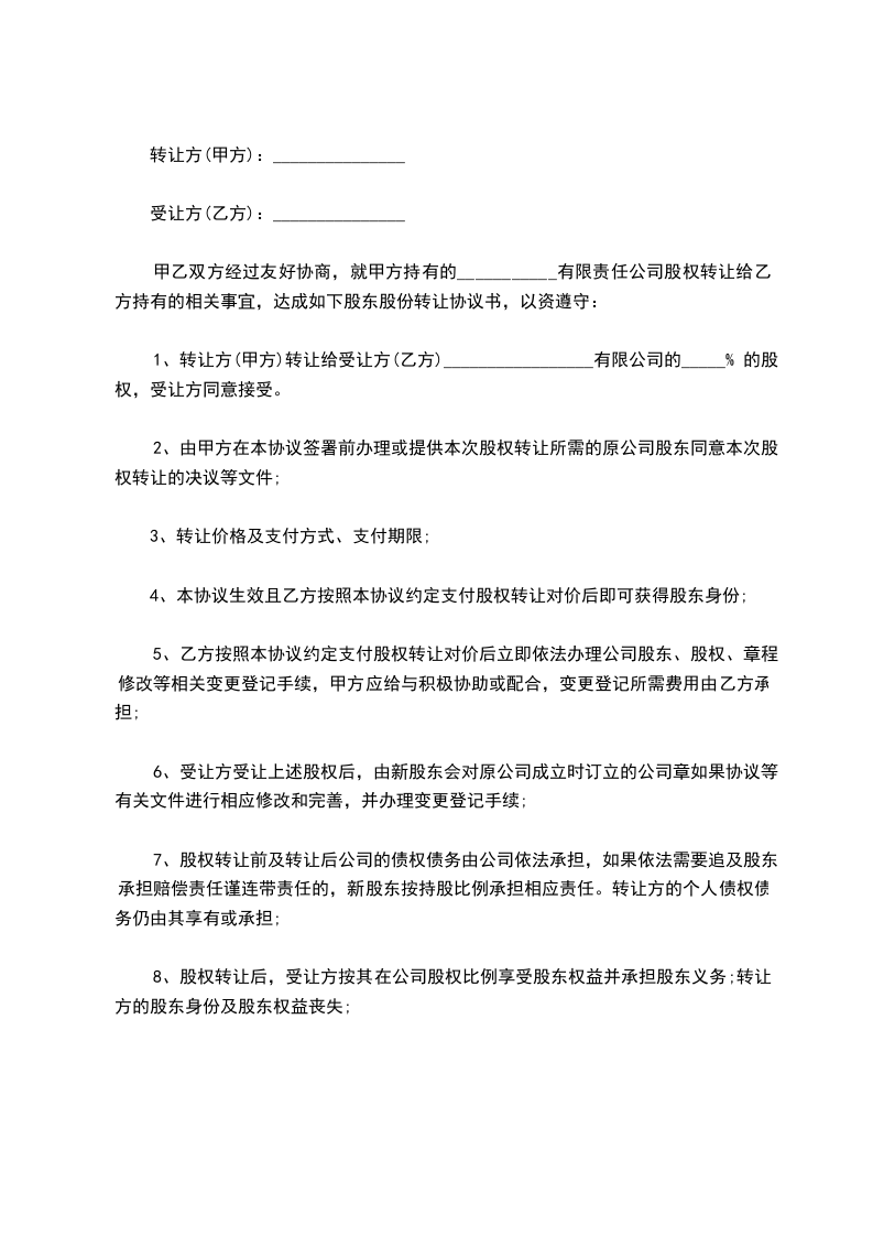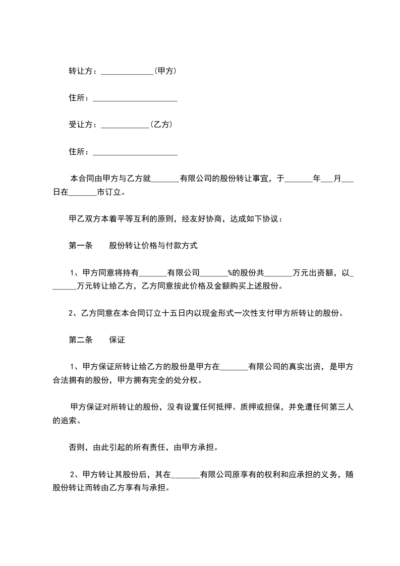 1、甲方同意将持有_______有限公司_______%的股份共_______万元出资额,以_______万元转让给乙方,乙方同意按此价格及金额购买上述股份。