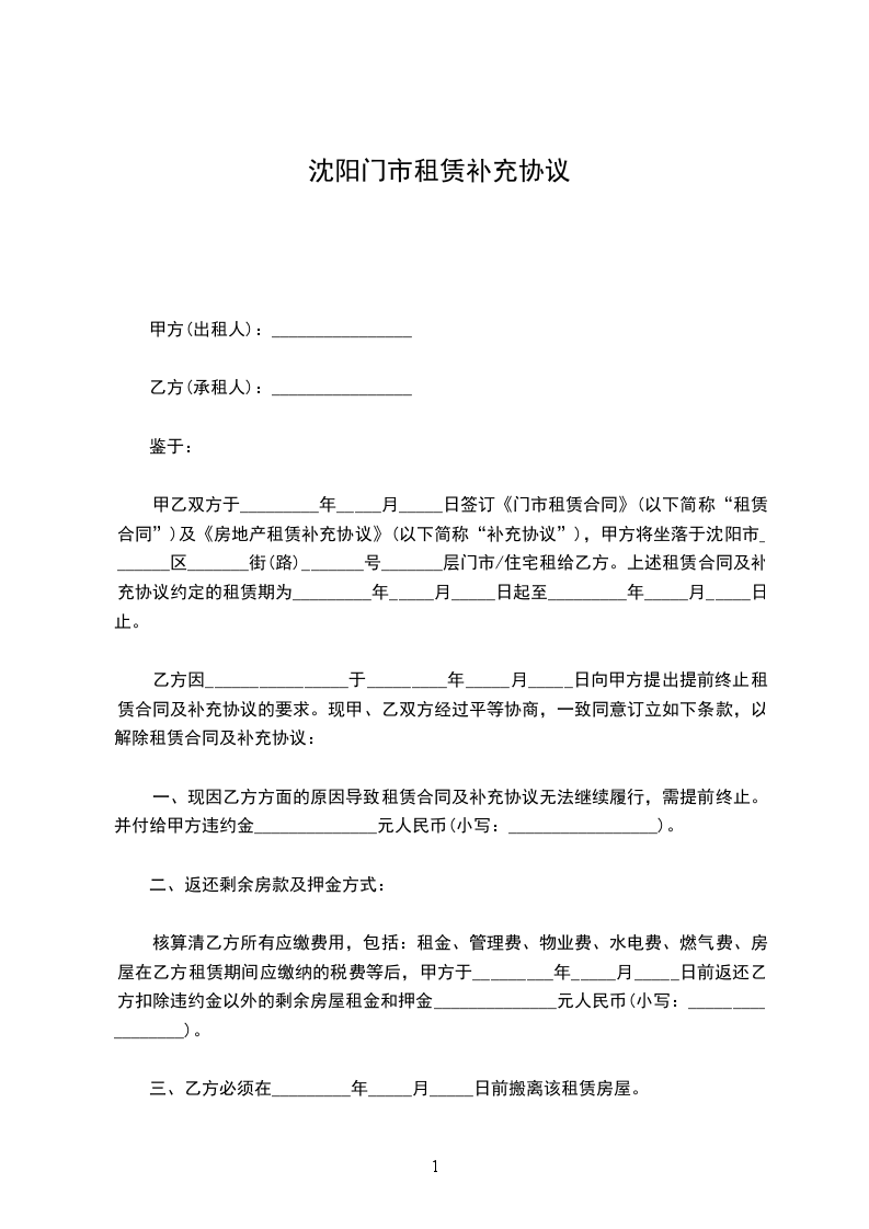 甲乙双方于_________年_____月_____日签订《门市租赁合同》(以下简称“租赁合同”)及《房地产租赁补充协议》(以下简称“补充协议”),甲方将坐落于沈阳市_______区_______街(路)_______号_______层门市/住宅租给乙方。上述租赁合同及补充协议约定的租赁期为_________年_____月_____日起至_________年_____月_____日止。