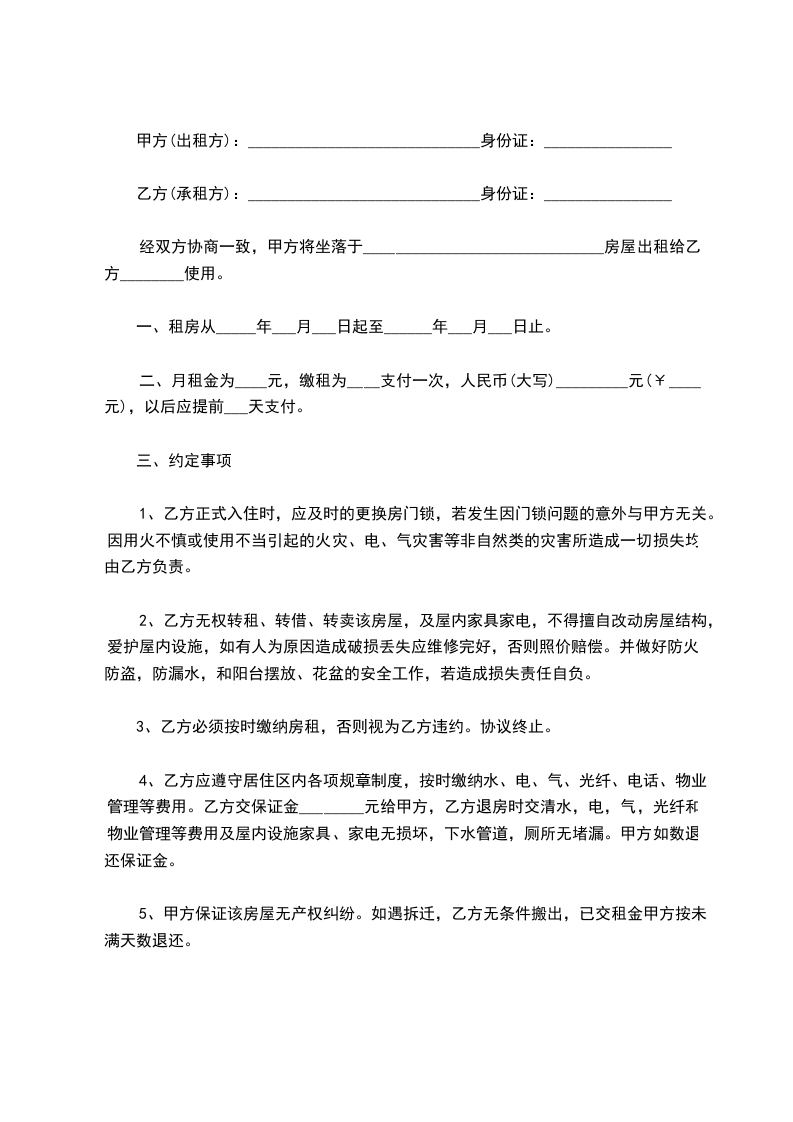 4、乙方应遵守居住区内各项规章制度,按时缴纳水、电、气、光纤、电话、物业管理等费用。乙方交保证金________元给甲方,乙方退房时交清水,电,气,光纤和物业管理等费用及屋内设施家具、家电无损坏,下水管道,厕所无堵漏。甲方如数退还保证金。