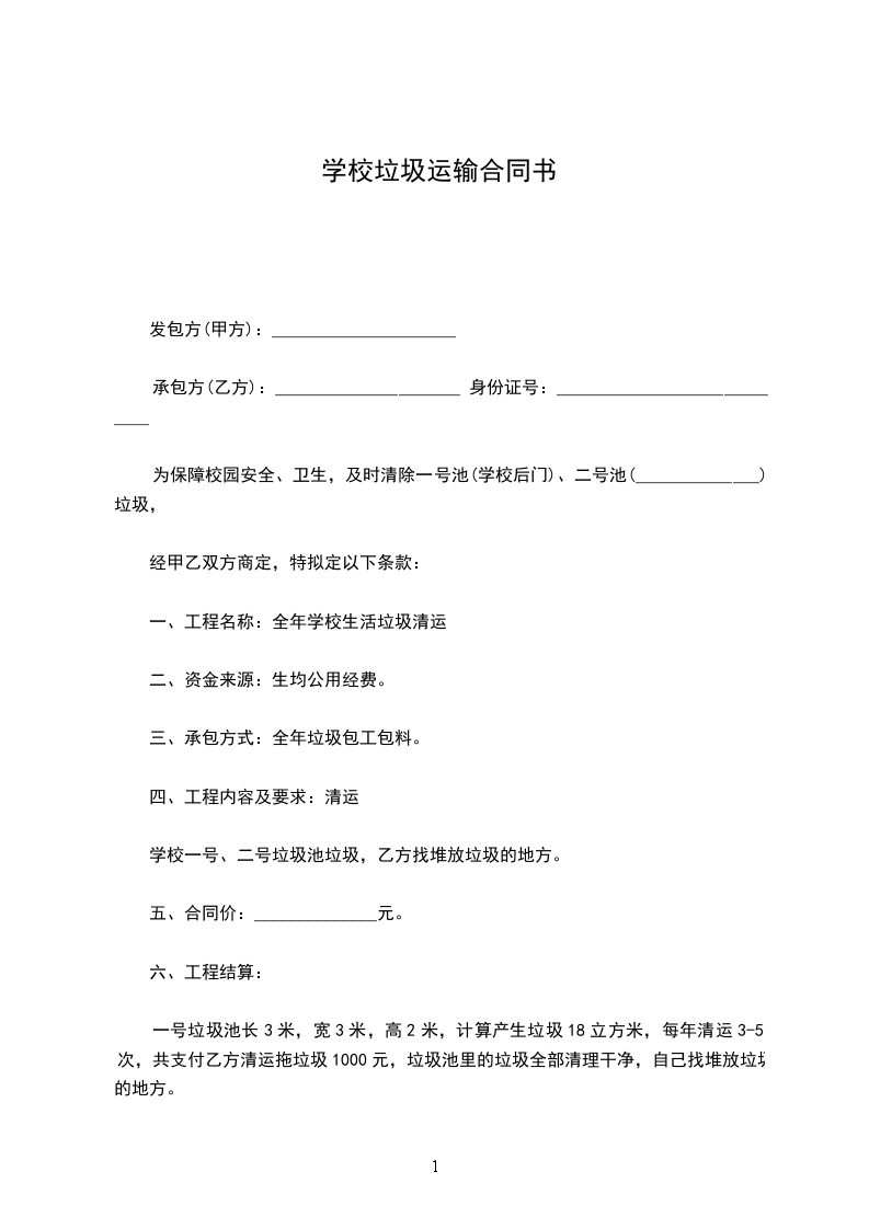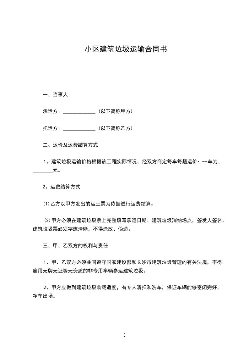 7、乙方承运甲方小区装修垃圾,每户为_____元,两个月结算一次运费给乙方,乙方提供给甲方与运输等值的油票。