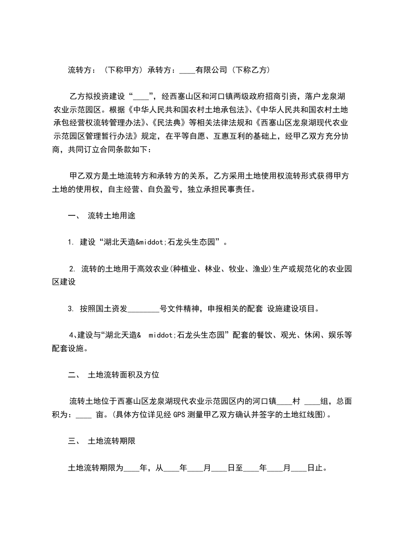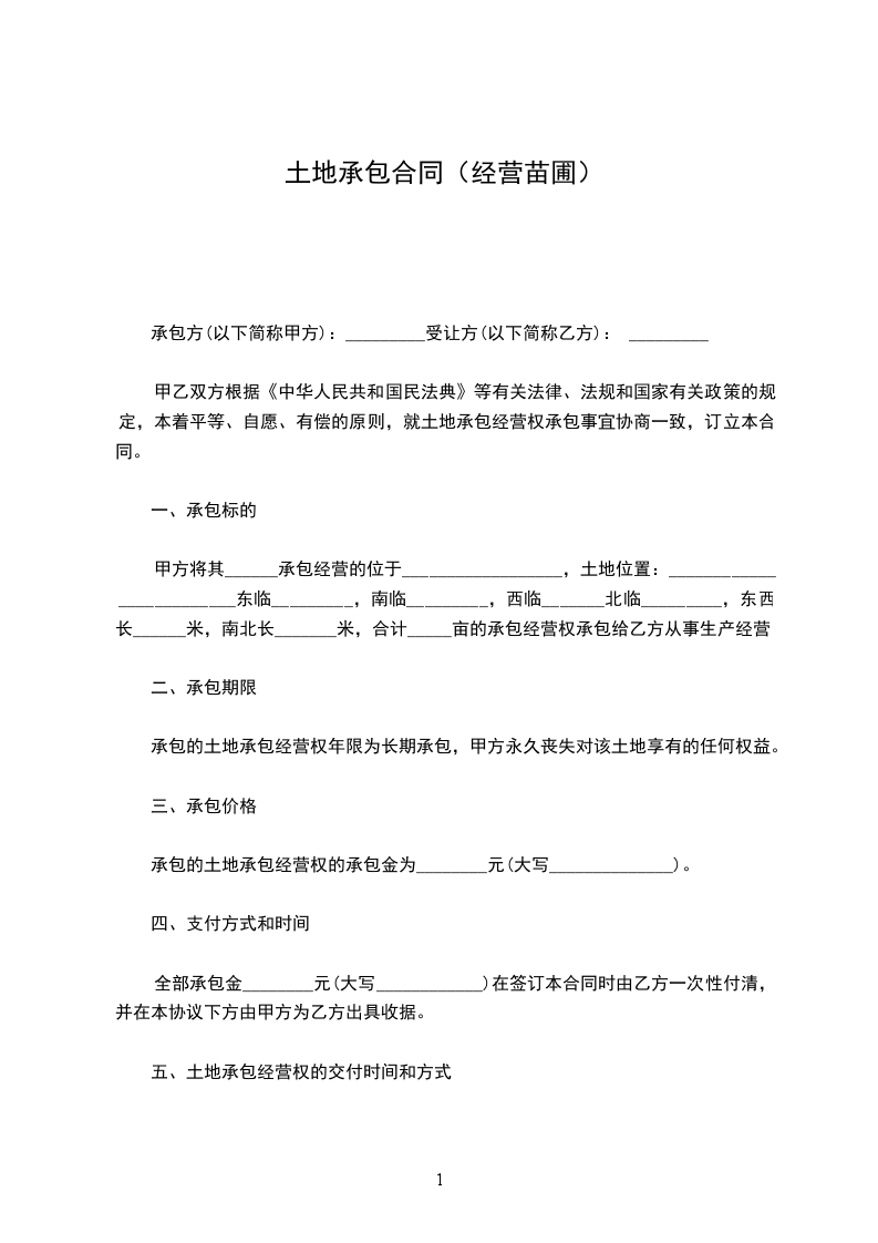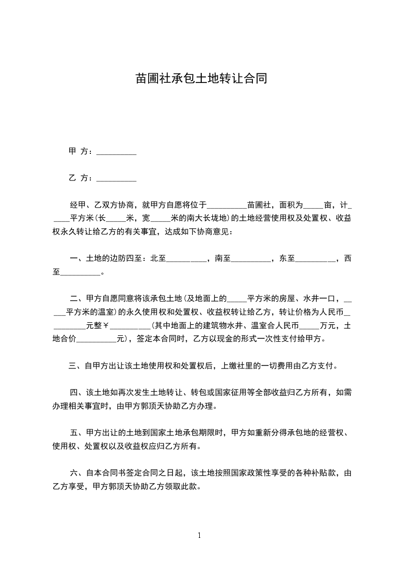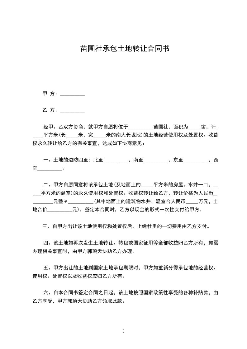 二、甲方自愿同意将该承包土地(及地面上的_____平方米的房屋、水井一口,_____平方米的温室)的永久使用权和处置权、收益权转让给乙方,转让价格为人民币__________元整¥__________(其中地面上的建筑物水井、温室合人民币_____万元,土地合价__________元),签定本合同时,乙方以现金的形式一次性支付给甲方。