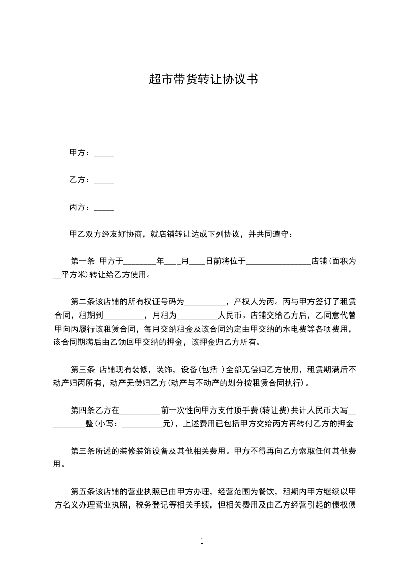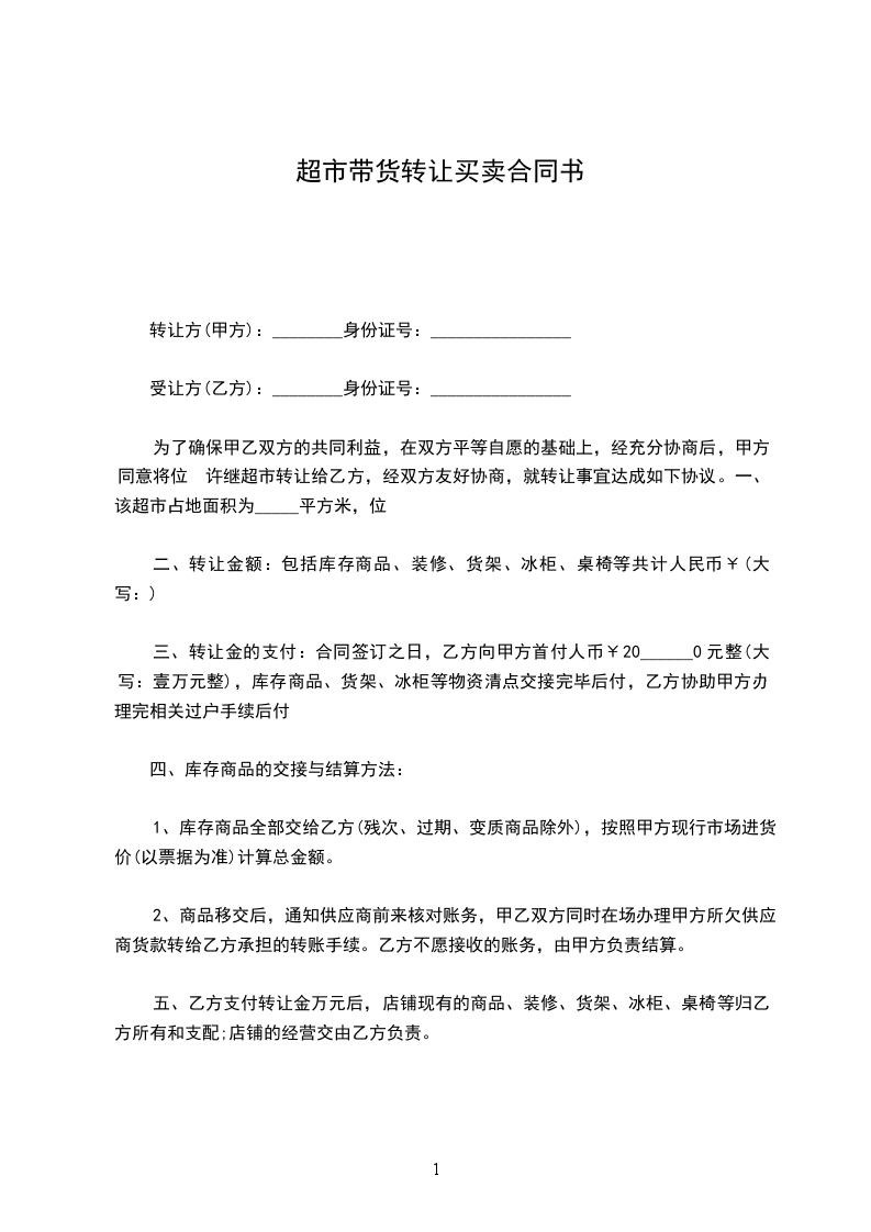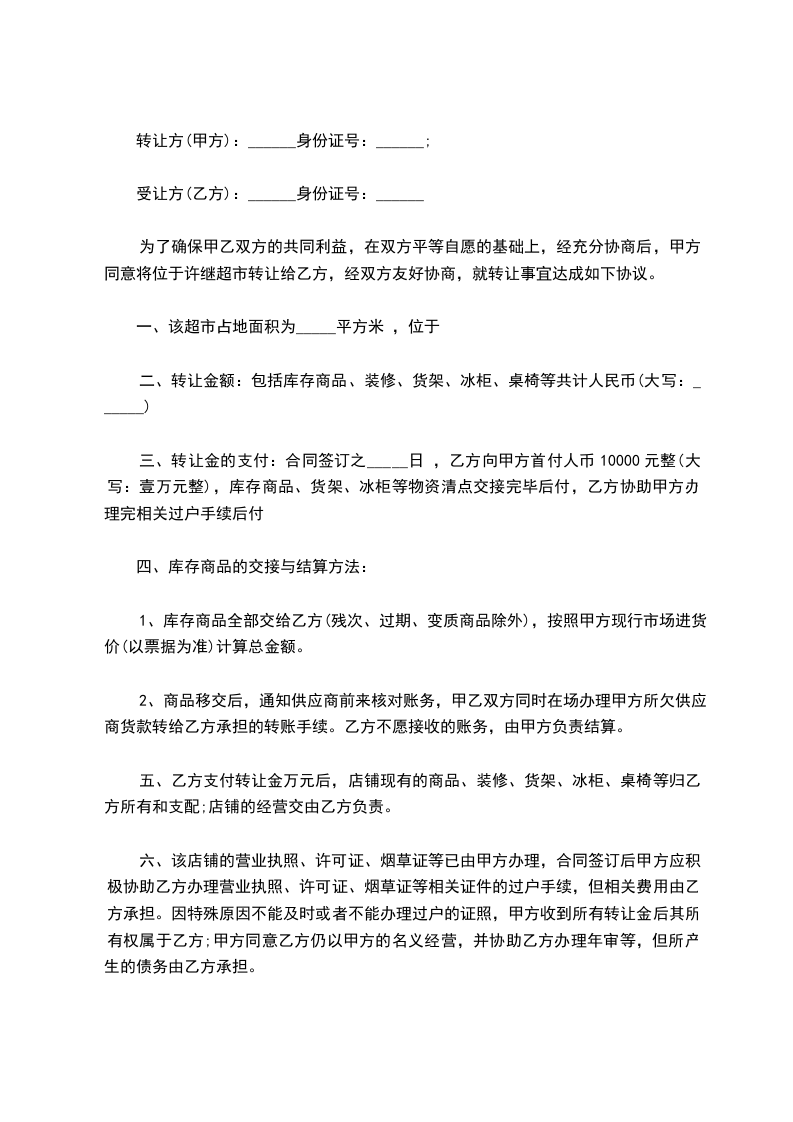 1、该超市占地面积为___________平方米,超市内一切货物及设施及相关手续转让总金额为___________元整(¥:___________)