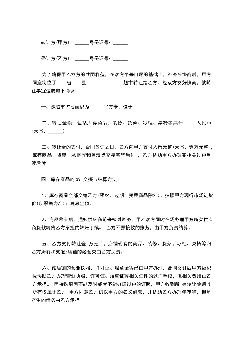 为了确保甲乙双方的共同利益,在双方平等自愿的基础上,经充分协商后,甲方同意将位于___________路口南侧___________超市正在营业中旺铺转让,双方具体达成如下协议: