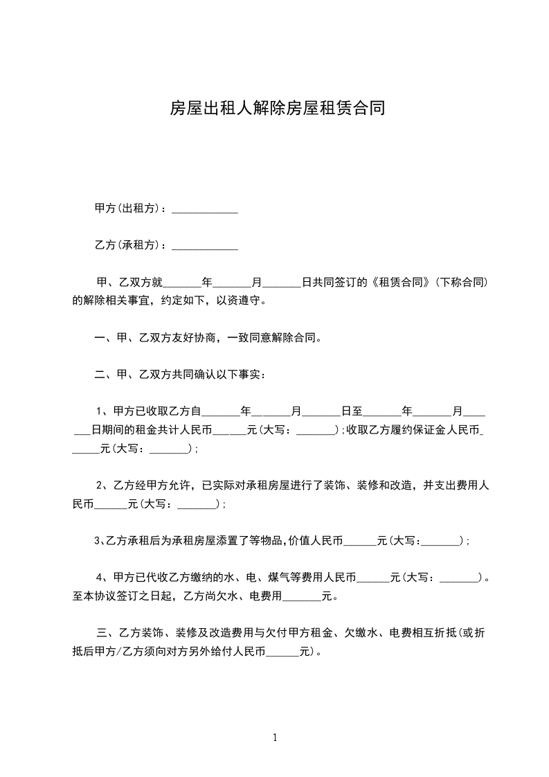 一、甲、乙双方友好协商,一致同意解除合同。