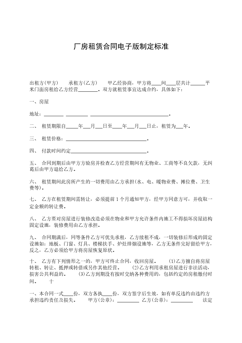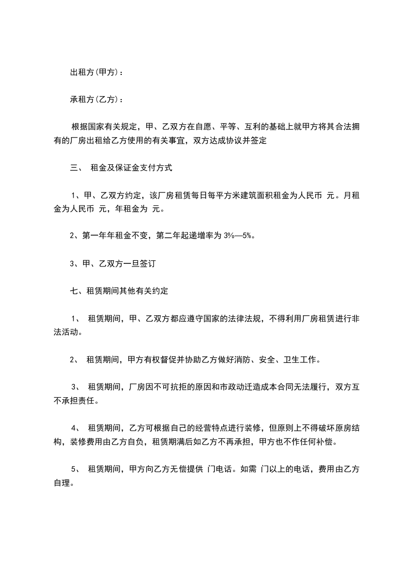 2、厂房租赁自_______年_______月_______日起,至_______年_______月_______日止。租赁期_______年。