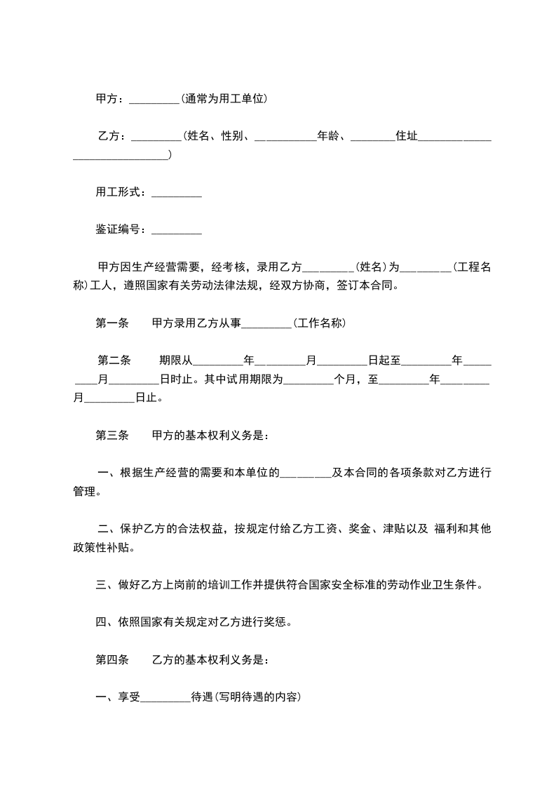 甲方因生产经营需要,经考核,录用乙方_________(姓名)为_________(工程名称)工人,遵照国家有关劳动法律法规,经双方协商,签订本合同。