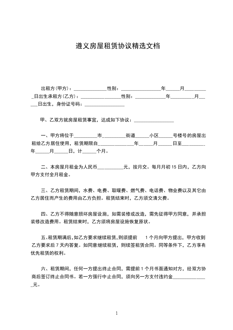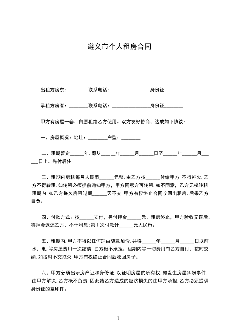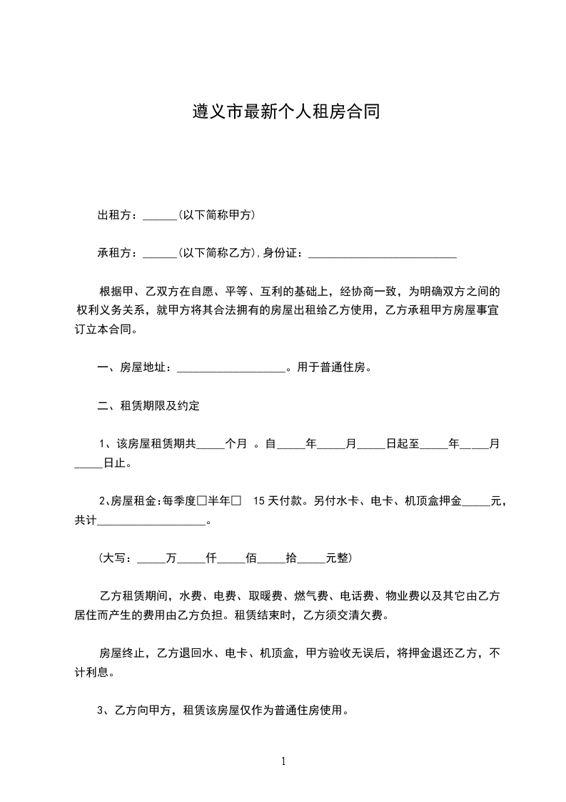 四、为保证本租房合同的全面履行,在签订本租房合同时,乙方应支付给甲方押金________元(____________元整)人民币(押金不计利息),合同期满,费用结清后本押金退还乙方。若乙方不履行租房合同,则押金不予返还;若甲方不履行租房合同,则应将押金全额返还并赔偿乙方________个月的租金费用作为因租房造成的损失。租赁期内,无特殊情况,甲乙双方不得私自随意加减租金和更改终止合同租赁期。
