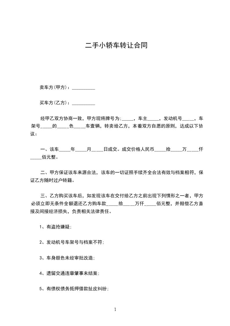 经甲乙双方协商一致,甲方现将牌号为;_____,车主_____,发动机号_____,车架号_____的_____色_____车壹辆,转卖给乙方,本着双方自愿的原则,达成以下协议: