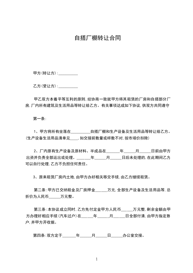 甲乙双方本着平等互利的原则,经协商一致就甲方将其租赁的厂房和自搭部分厂房,厂内所有建筑及生活用品等转让给乙方。有关事项达成如下协议,供双方共同遵守。