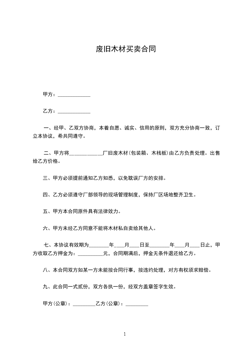 二、甲方将_____________厂旧废木材(包装箱、木栈板)由乙方负责处理。出售给乙方价格。