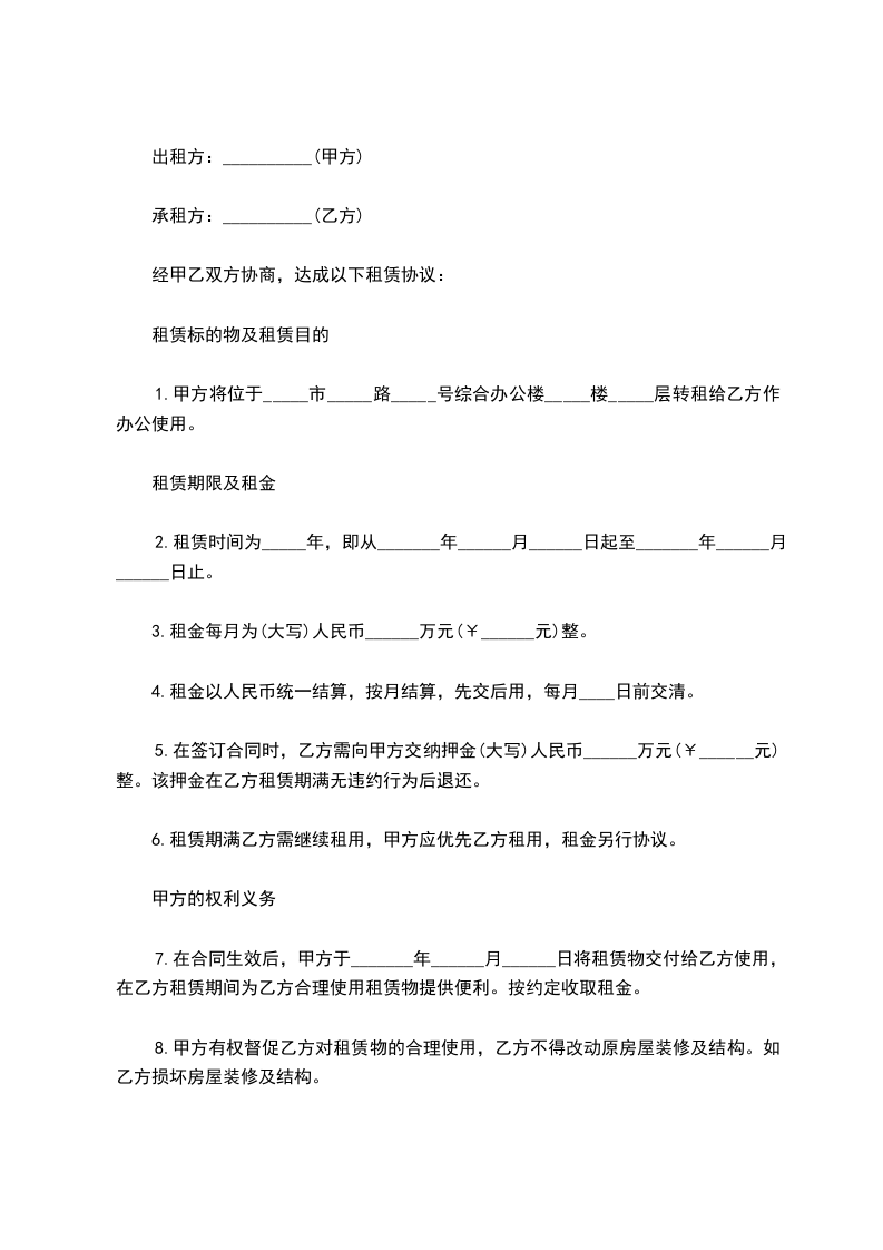 1.甲方将位于_____市_____路_____号综合办公楼_____楼_____层转租给乙方作办公使用。