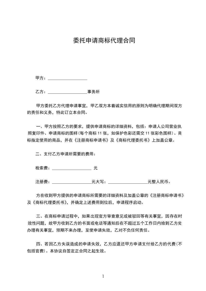 1、本合同自双方签章之日起生效。若委托事项为商标申请注册,则乙方工作至该申请取得“商标注册证”,或该申请被商标局被驳回之日。