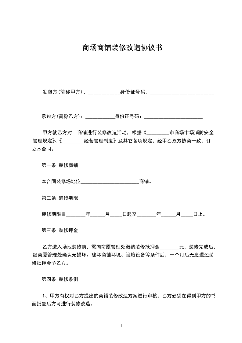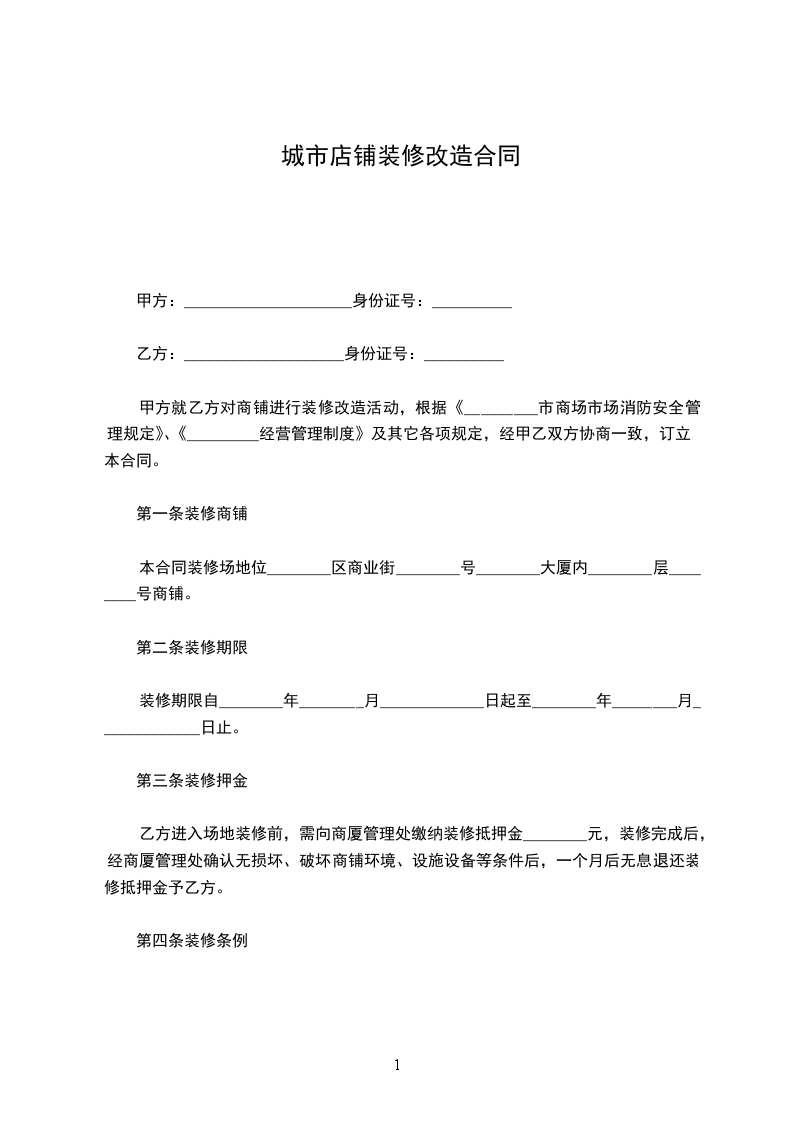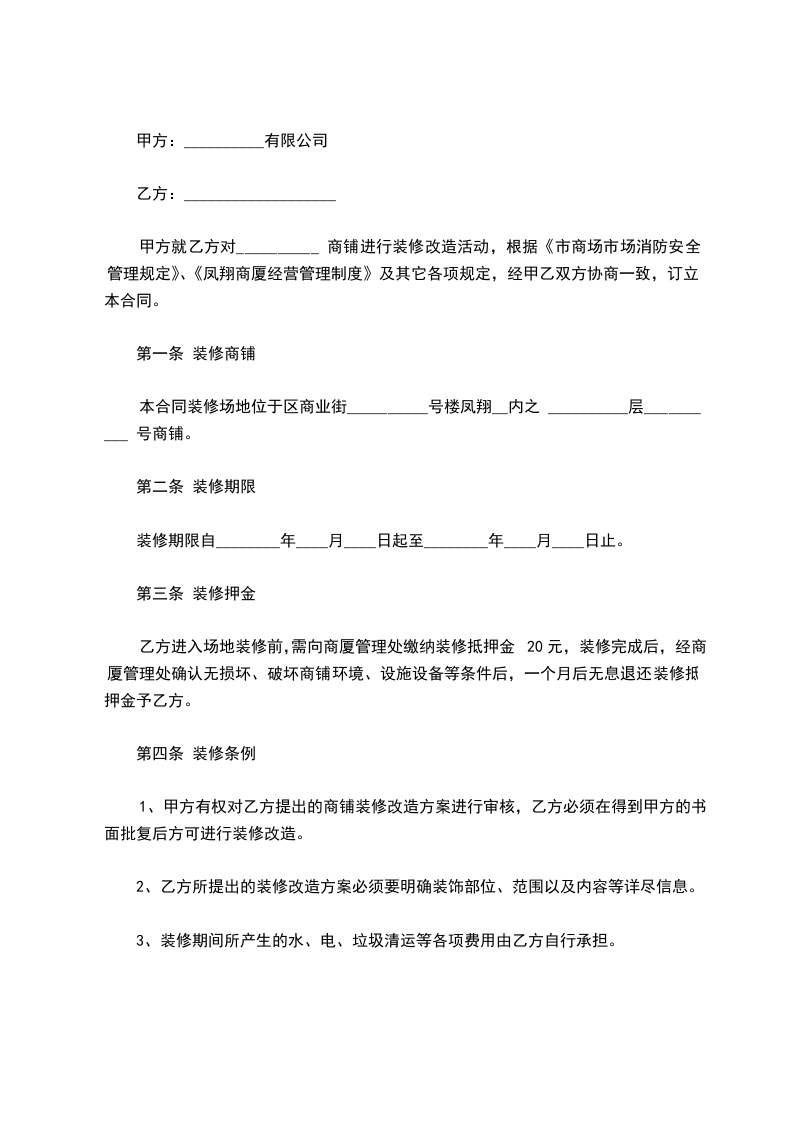 甲方就乙方对_____ 商铺进行装修改造活动,根据《__市商场市场消防安全管理规定》、《__商厦经营管理制度》及其它各项规定,经甲乙双方协商一致,订立本合同。