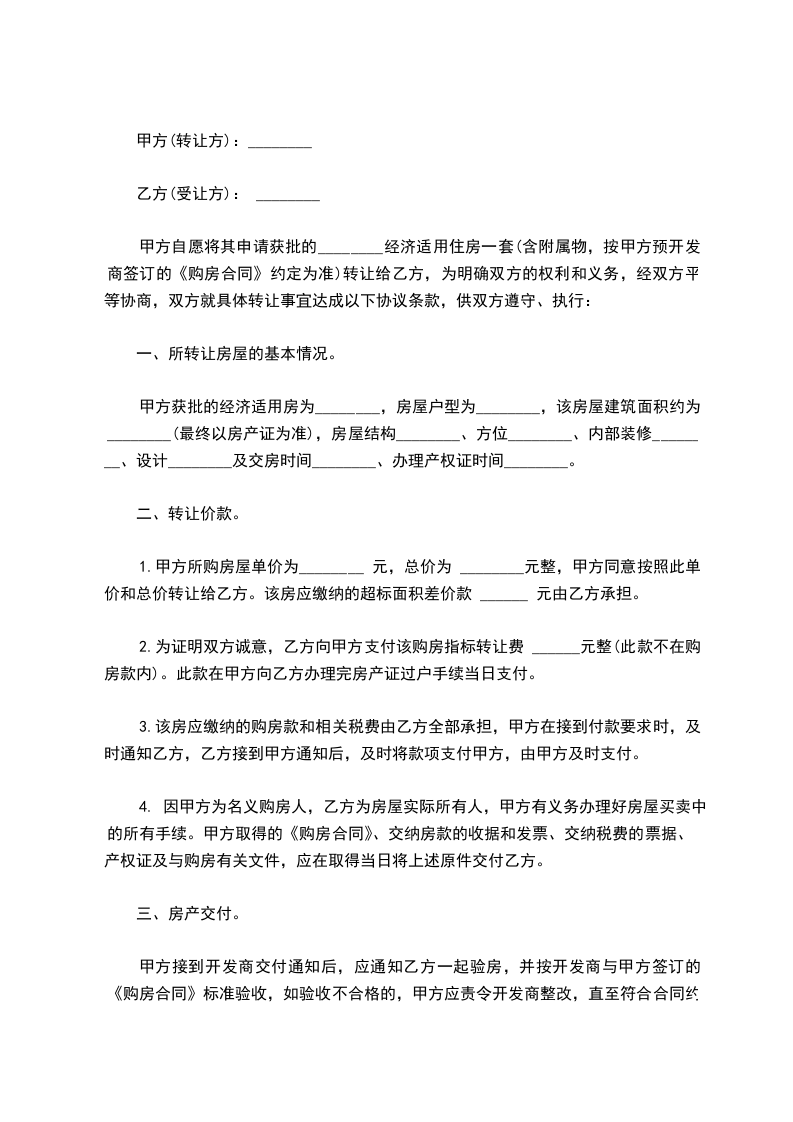 甲方自愿将其申请获批的________经济适用住房一套(含附属物,按甲方预开发商签订的《购房合同》约定为准)转让给乙方,为明确双方的权利和义务,经双方平等协商,双方就具体转让事宜达成以下协议条款,供双方遵守、执行: