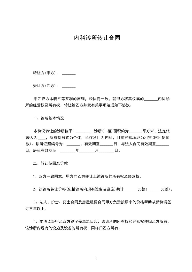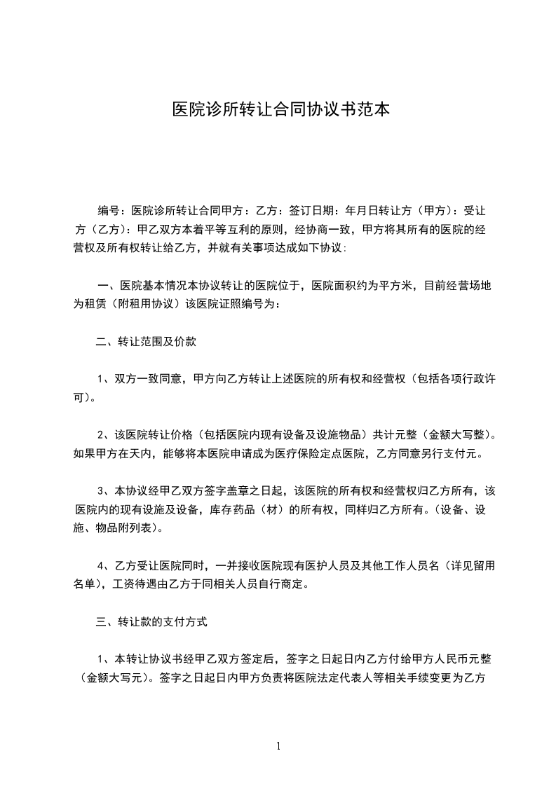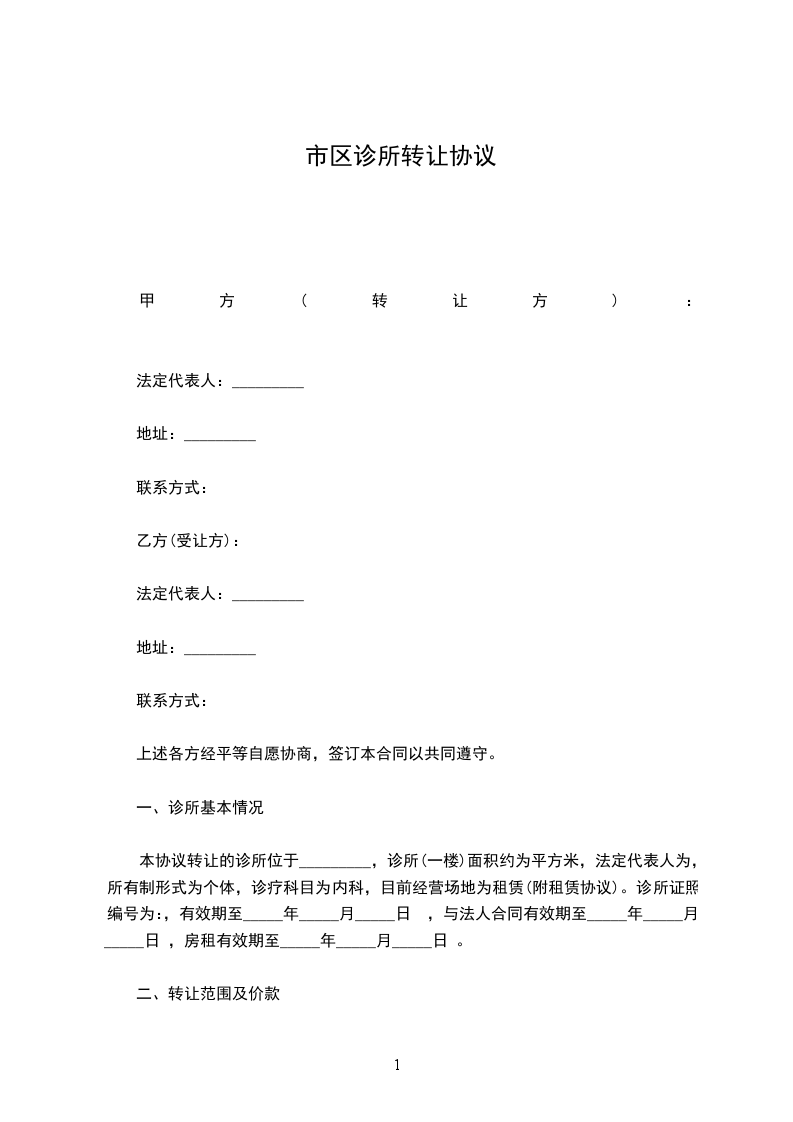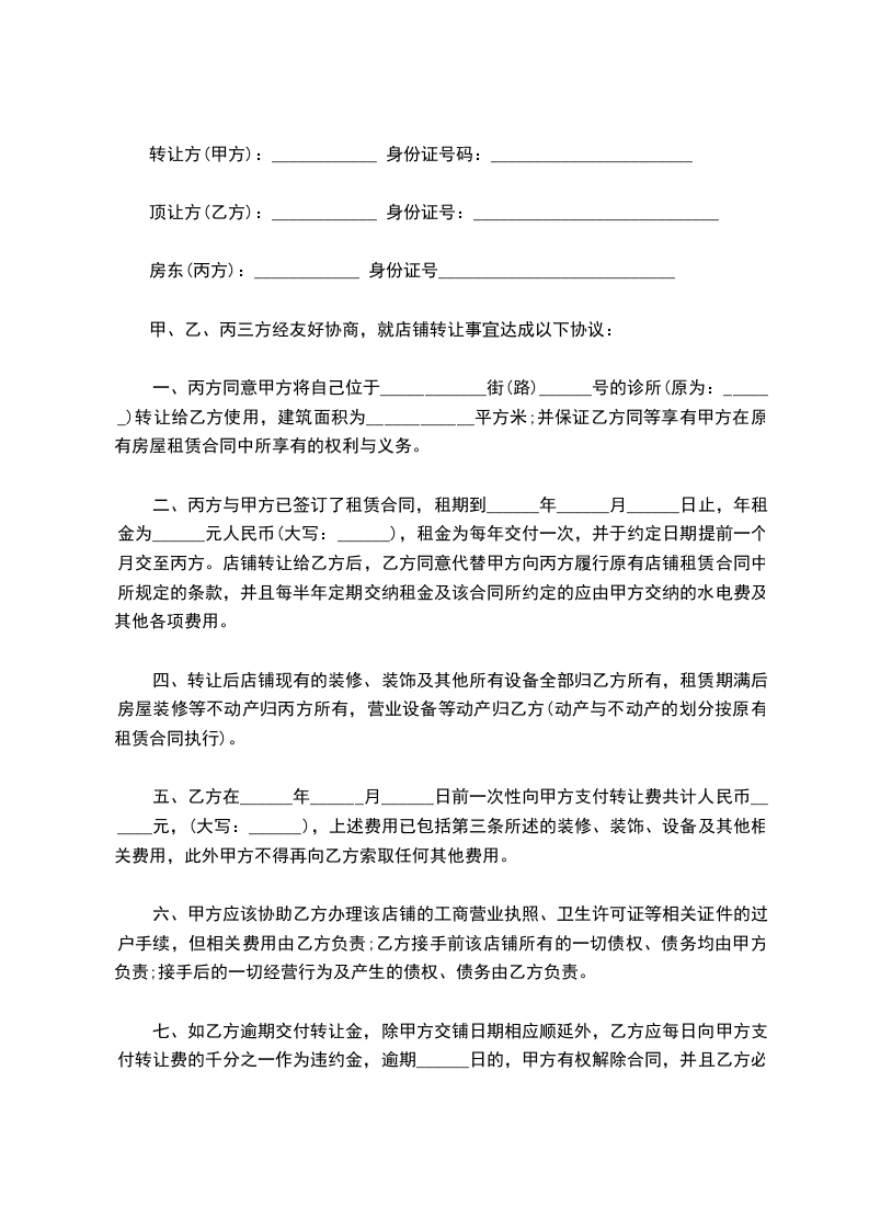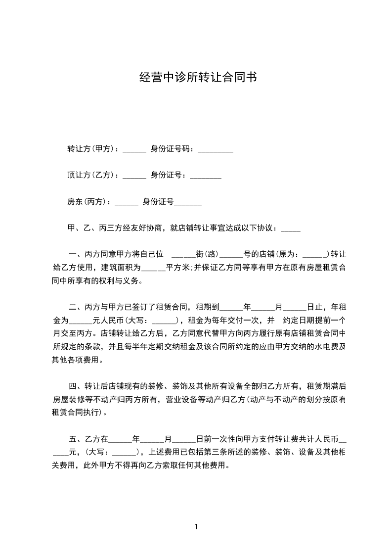 一、丙方同意甲方将自己位于____________街(路)______号的诊所(原为:______)转让给乙方使用,建筑面积为____________平方米;并保证乙方同等享有甲方在原有房屋租赁合同中所享有的权利与义务。