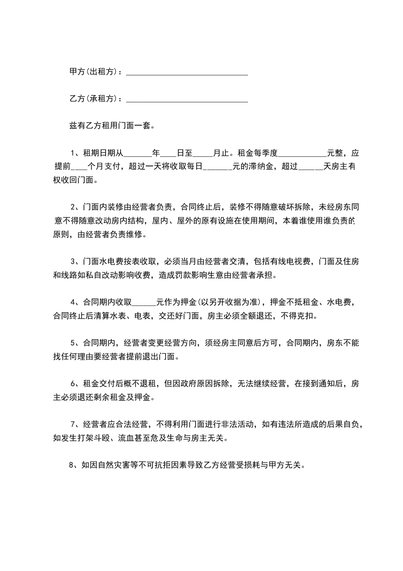 8、如因自然灾害等不可抗拒因素导致乙方经营受损耗与甲方无关。