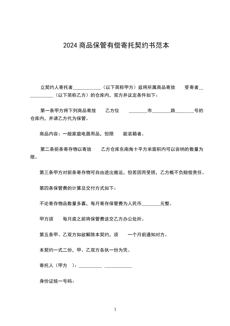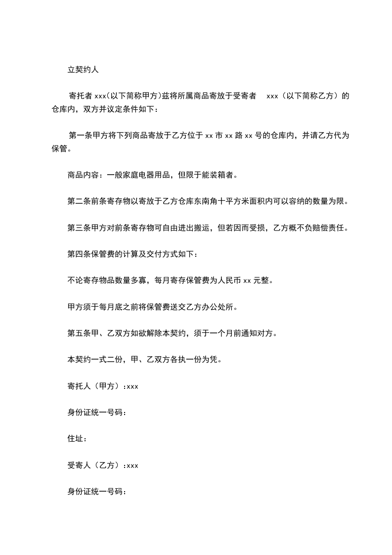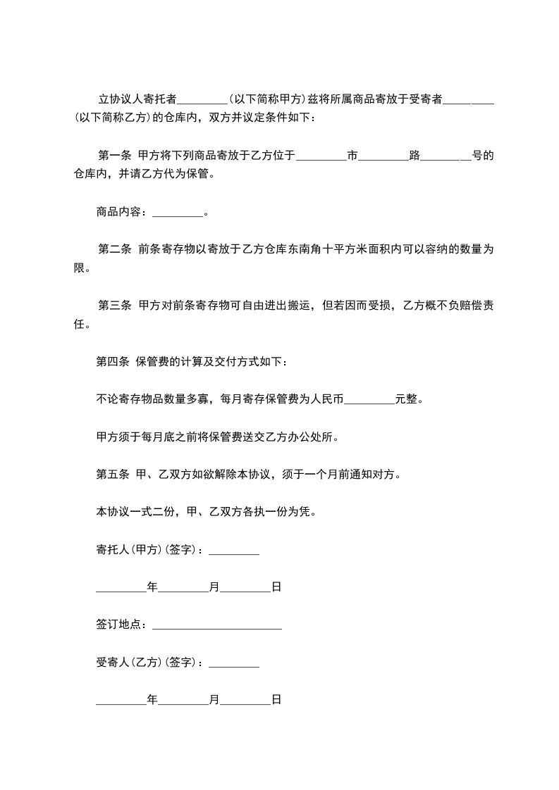 第一条甲方将下列商品寄放于乙方位于xx市xx路xx号的仓库内,并请乙方代为保管。