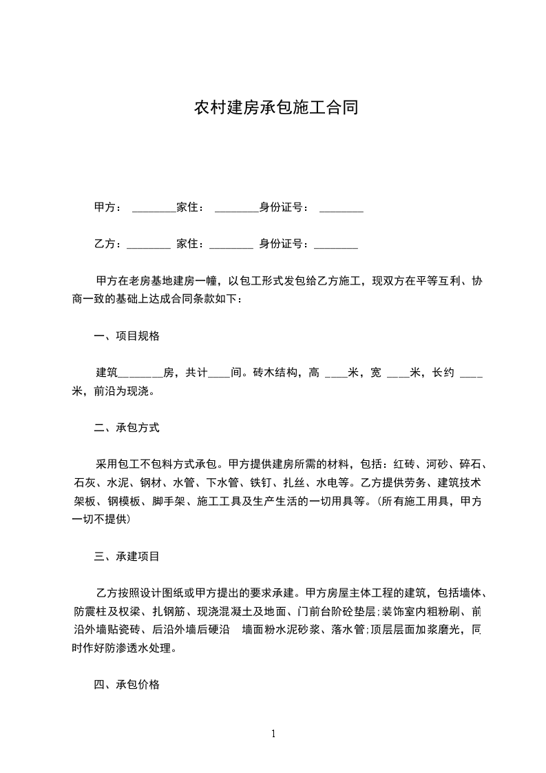 采用包工不包料方式承包。甲方提供建房所需的材料,包括:红砖、河砂、碎石、石灰、水泥、钢材、水管、下水管、铁钉、扎丝、水电等。乙方提供劳务、建筑技术、架板、钢模板、脚手架、施工工具及生产生活的一切用具等。(所有施工用具,甲方一切不提供)
