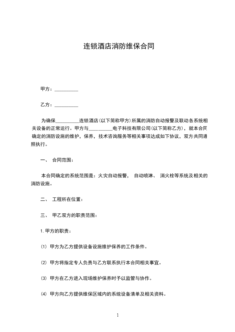 为确保__________连锁酒店(以下简称甲方)所属的消防自动报警及联动各系统相关设备的正常运行。甲方与__________电子科技有限公司(以下简称乙方),就本合同确定的消防设施的维护,保养,技术咨询服务等相关事项达成如下协议,双方共同遵照执行。