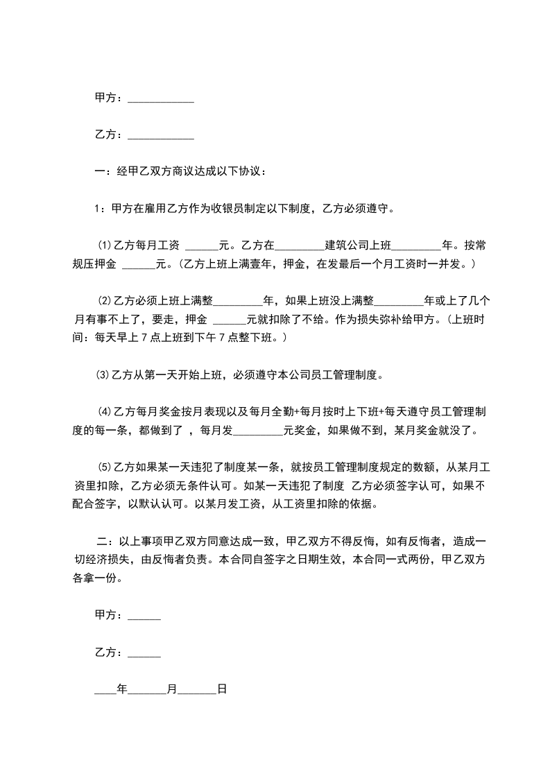 1:甲方在雇用乙方作为收银员制定以下制度,乙方必须遵守。