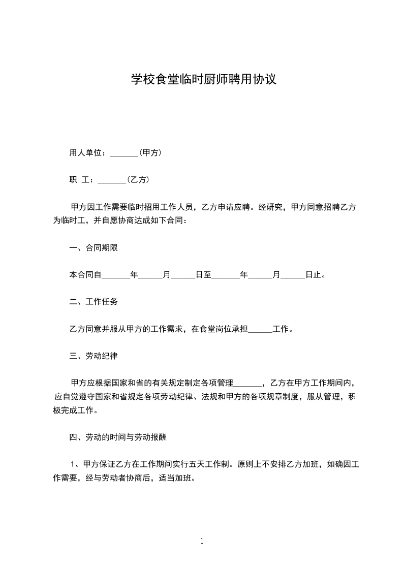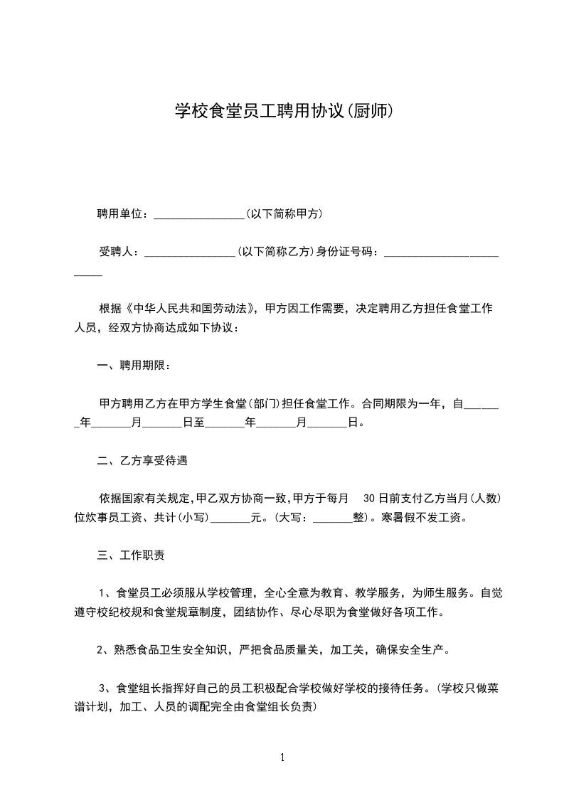 (一)、甲方根据工作需要及乙方所具备的工作能力,聘用乙方为______单位厨师工作,在聘用期内,甲方也可以根据工作需要,征得乙方同意,调整乙方能够胜任的工作岗位。