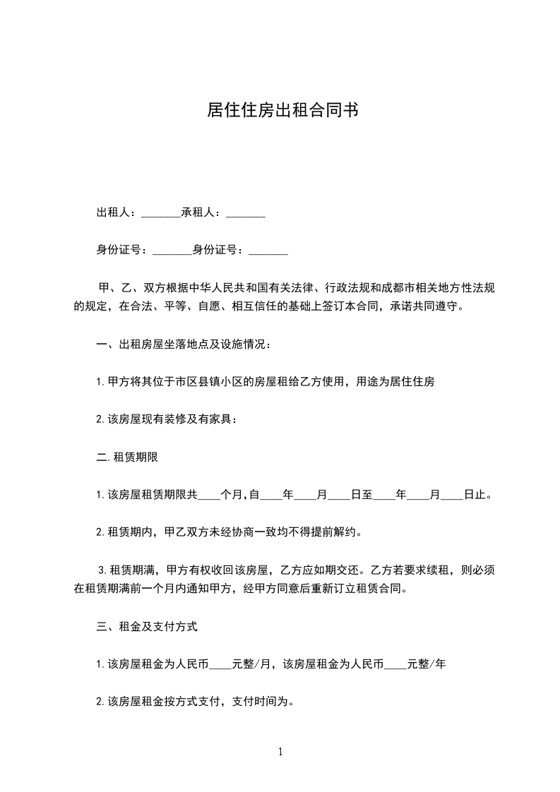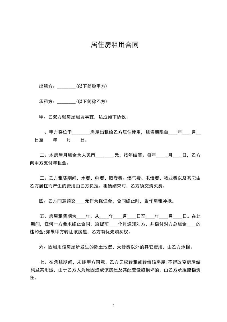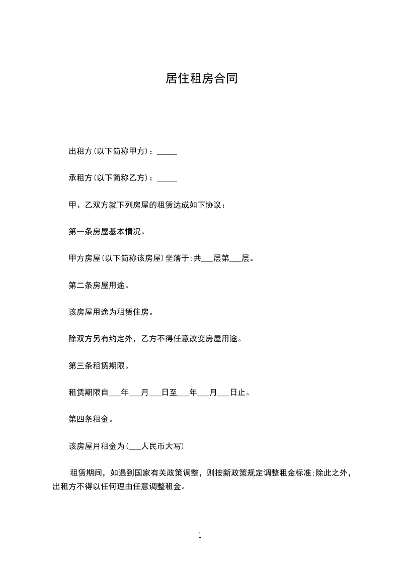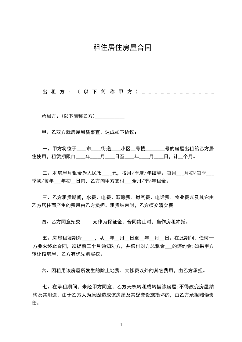 一、甲方将位于____市____街道____小区__号楼________号的房屋出租给乙方居住使用,租赁期限自__________年_______月____日至__________年_______月____日,计__个月。