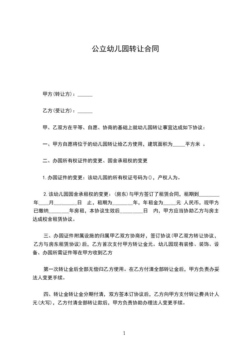 一、甲方将位于_______幼儿园经房东同意于_______日转让给乙方使用,以后有关房屋租用问题均由乙方与房东协商,与甲方无关。