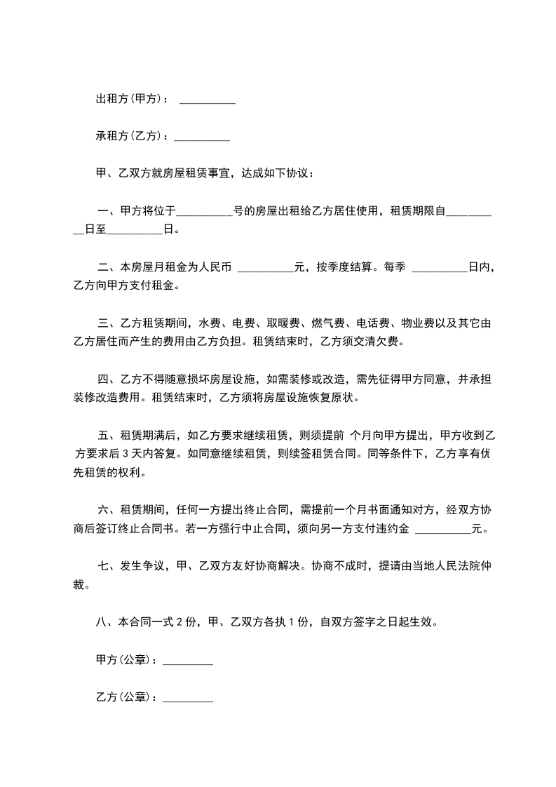 一、甲方将位于__________号的房屋出租给乙方居住使用,租赁期限自__________日至__________日。