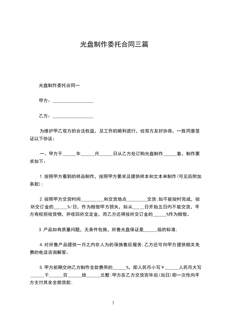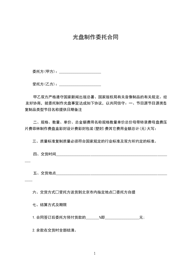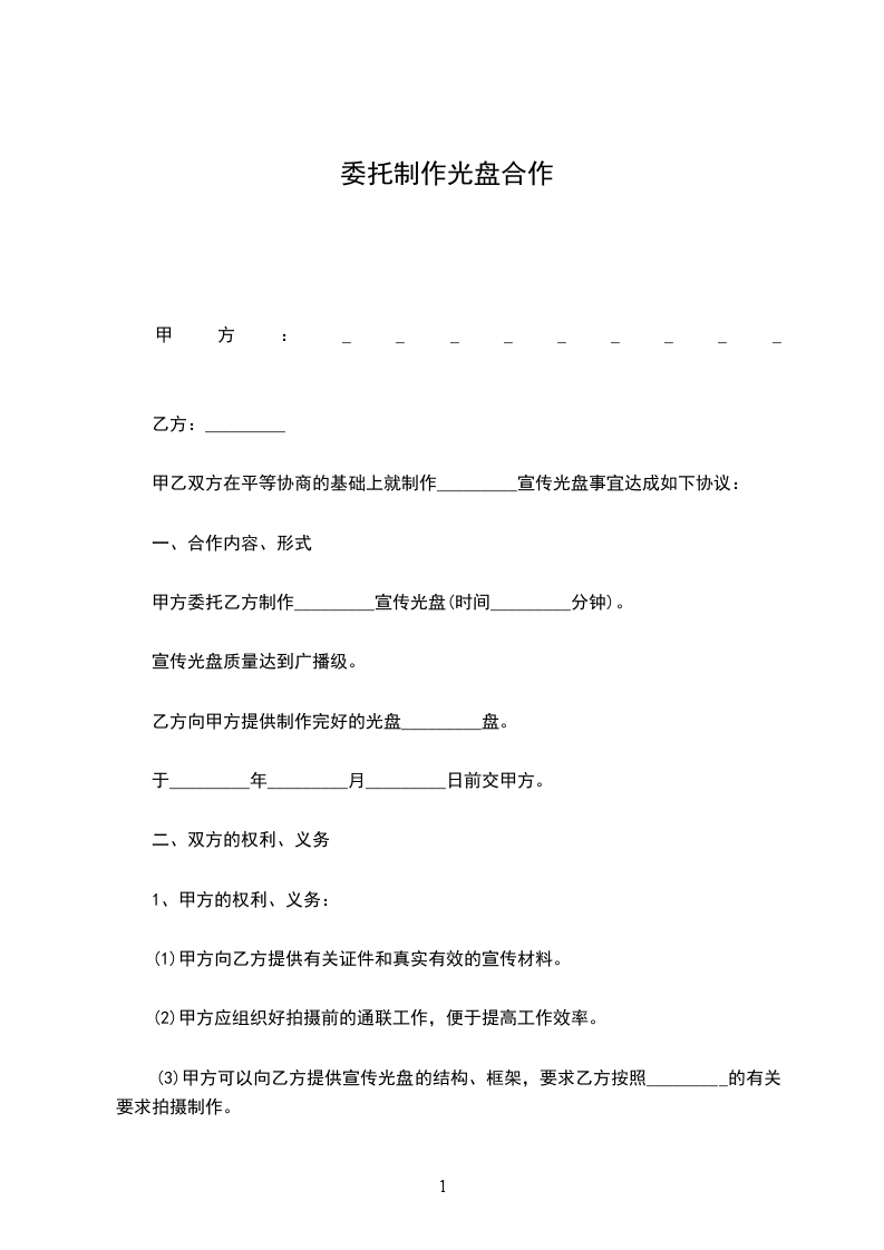 甲方委托乙方制作_________宣传光盘(时间_________分钟)。宣传光盘质量达到广播级。乙方向甲方提供制作完好的光盘_________盘,于_________年_________月_________日前交甲方。