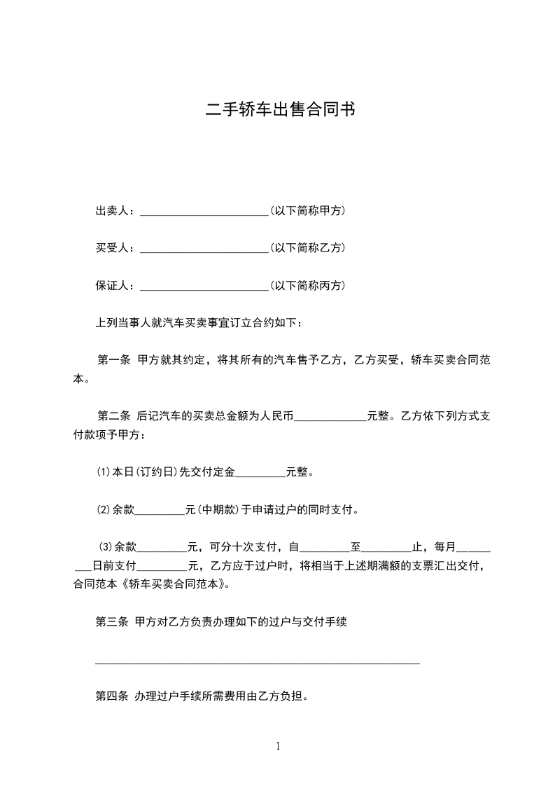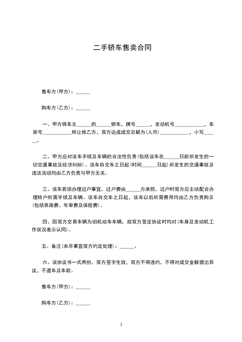 一、甲方将车主______的______轿车,牌号______,发动机号____________,车架号____________转让给乙方,双方达成成交总额为(人币)____________,小写______。