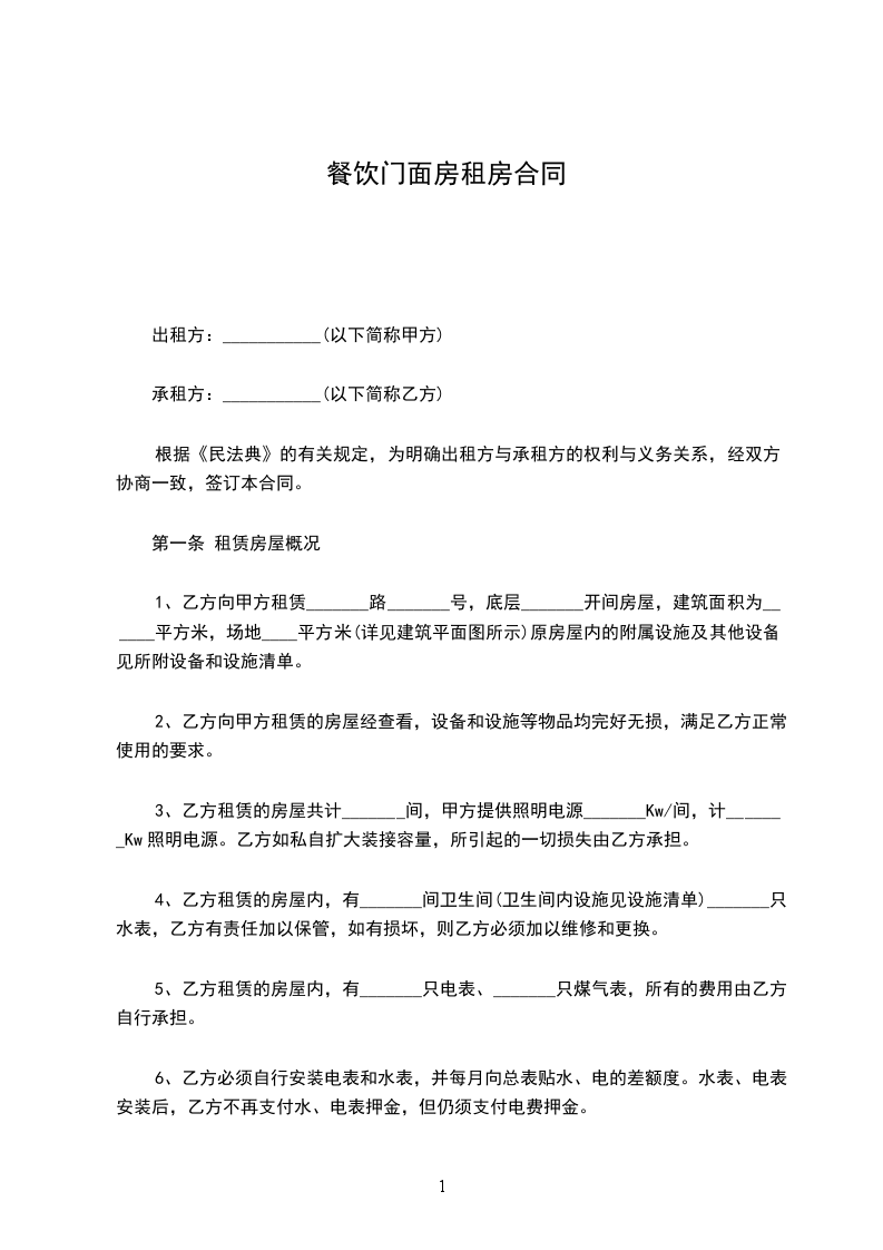 1、乙方向甲方租赁_______路_______号,底层_______开间房屋,建筑面积为______平方米,场地____平方米(详见建筑平面图所示)原房屋内的附属设施及其他设备见所附设备和设施清单。