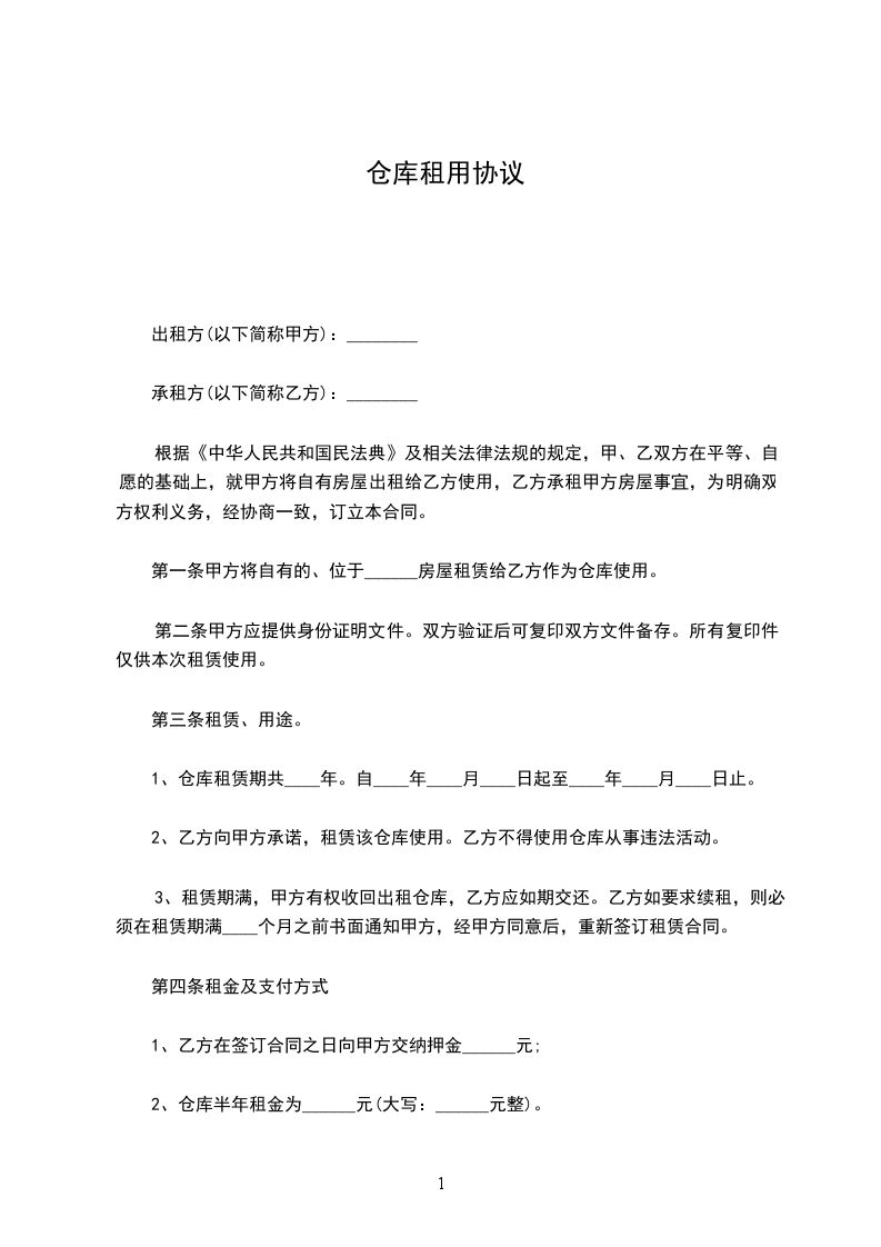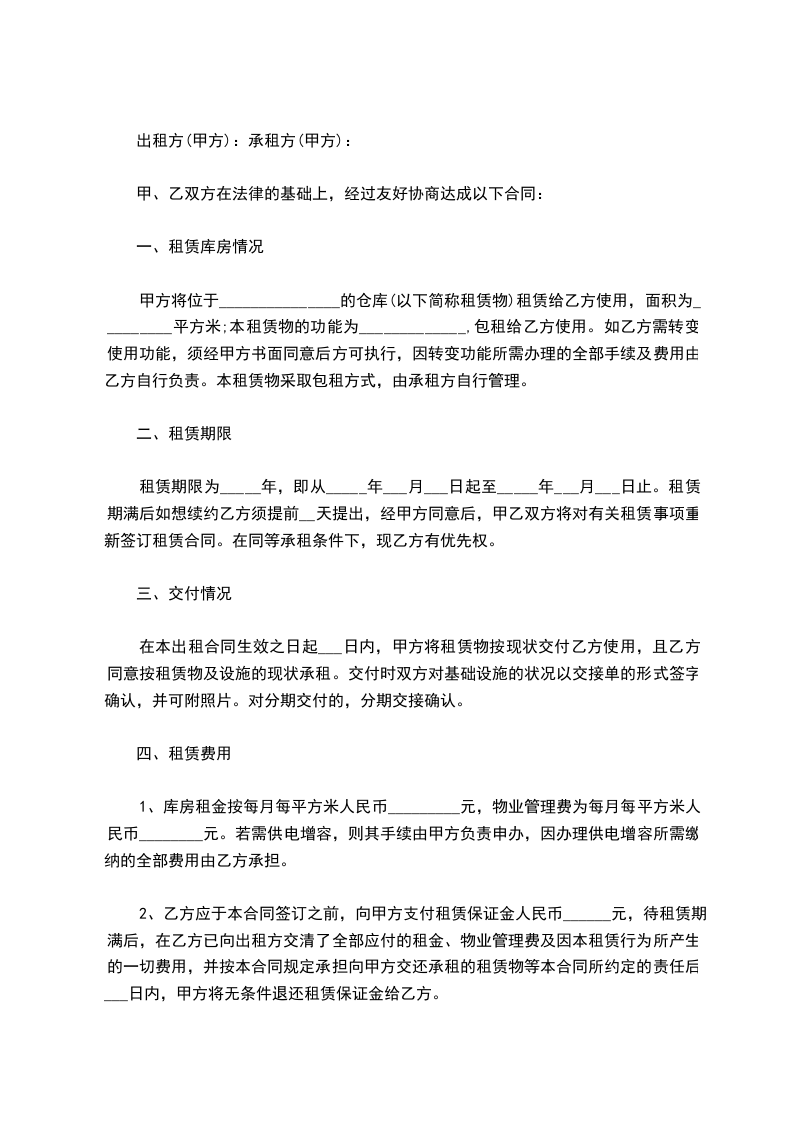 1、仓库租金按每年人民币__________ ,__________日前一次付清。