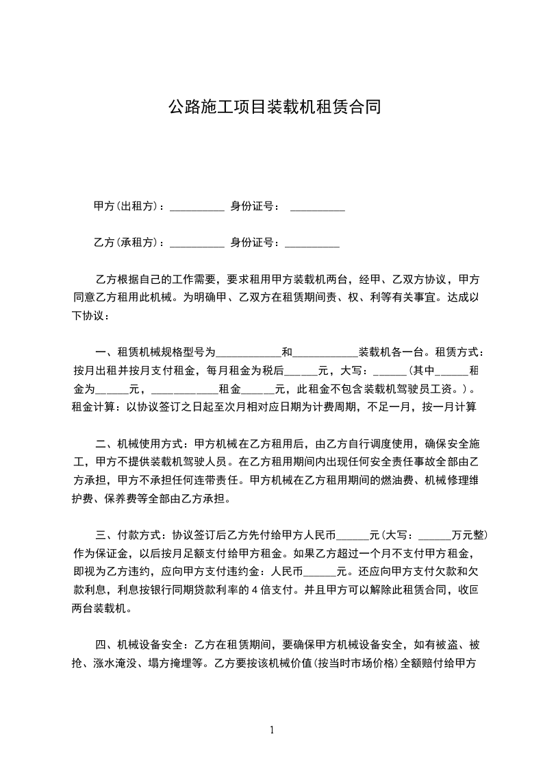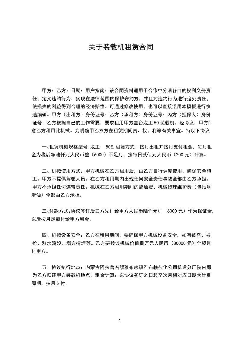 五、协议执行地点:______省______州______县______镇______村建设施工工地即为乙方归还甲方装载机地点。