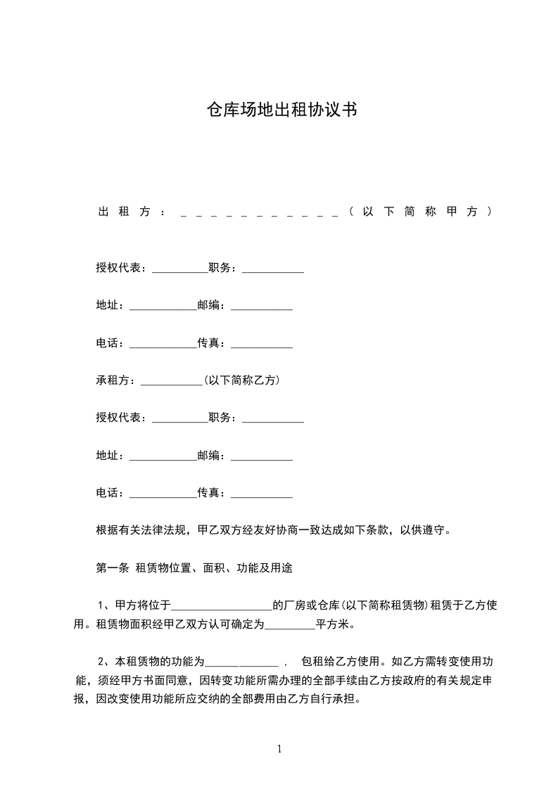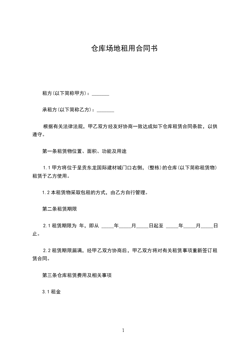 甲方将位于______市______乡______村之库房(以下简称租赁物)租赁给乙方使用。租赁物面积经甲乙双方认可确定为______平方米。