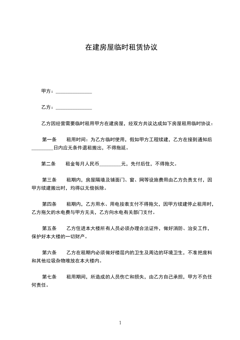 乙方因经营需要临时租用甲方在建房屋,经双方共议达成如下房屋租用临时协议: