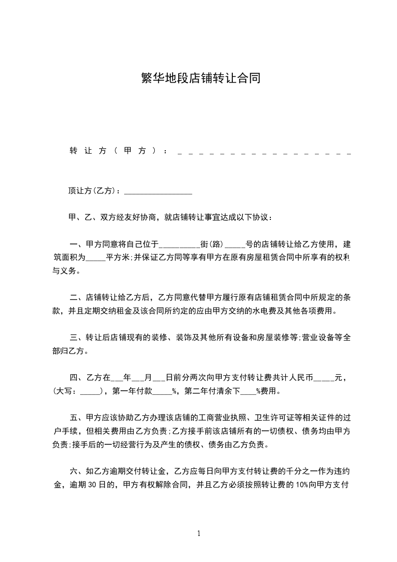 一、甲方同意将自己位于__________街(路)_____号的店铺转让给乙方使用,建筑面积为_____平方米;并保证乙方同等享有甲方在原有房屋租赁合同中所享有的权利与义务。