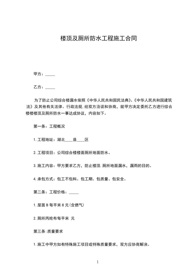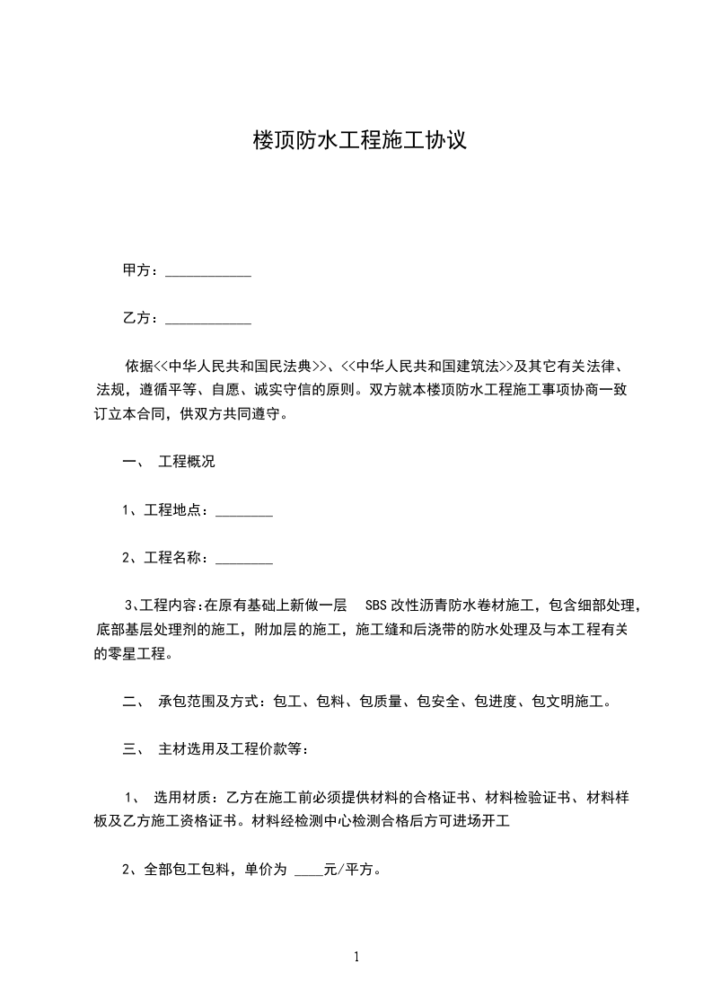 依据<<中华人民共和国民法典>>、<<中华人民共和国建筑法>>及其它有关法律、法规,遵循平等、自愿、诚实守信的原则。双方就本楼顶防水工程施工事项协商一致,订立本合同,供双方共同遵守。