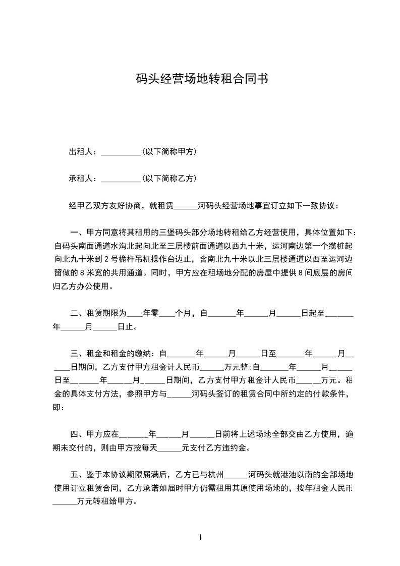 四、鉴于本协议期限届满后,乙方已与杭州______河码头就港池以南的全部场地使用订立租赁合同,乙方承诺如届时甲方仍需租用其原使用场地的,按年租金人民币____________万元转租给甲方。
