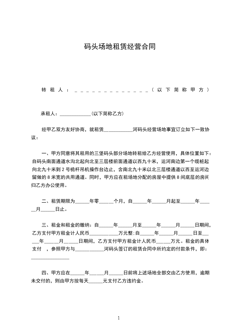 一、甲方同意将其租用的三堡码头部分场地转租给乙方经营使用,具体位置如下:自码头南面通道水沟北起向北至三层楼前面通道以西九十米,运河南边第一个缆桩起向北九十米到2号桅杆吊机操作台边止,含南北九十米以北三层楼通道以西至运河边留做的8米宽的共用通道。同时,甲方应在租场地分配的房屋中提供8间底层的房间归乙方办公使用。
