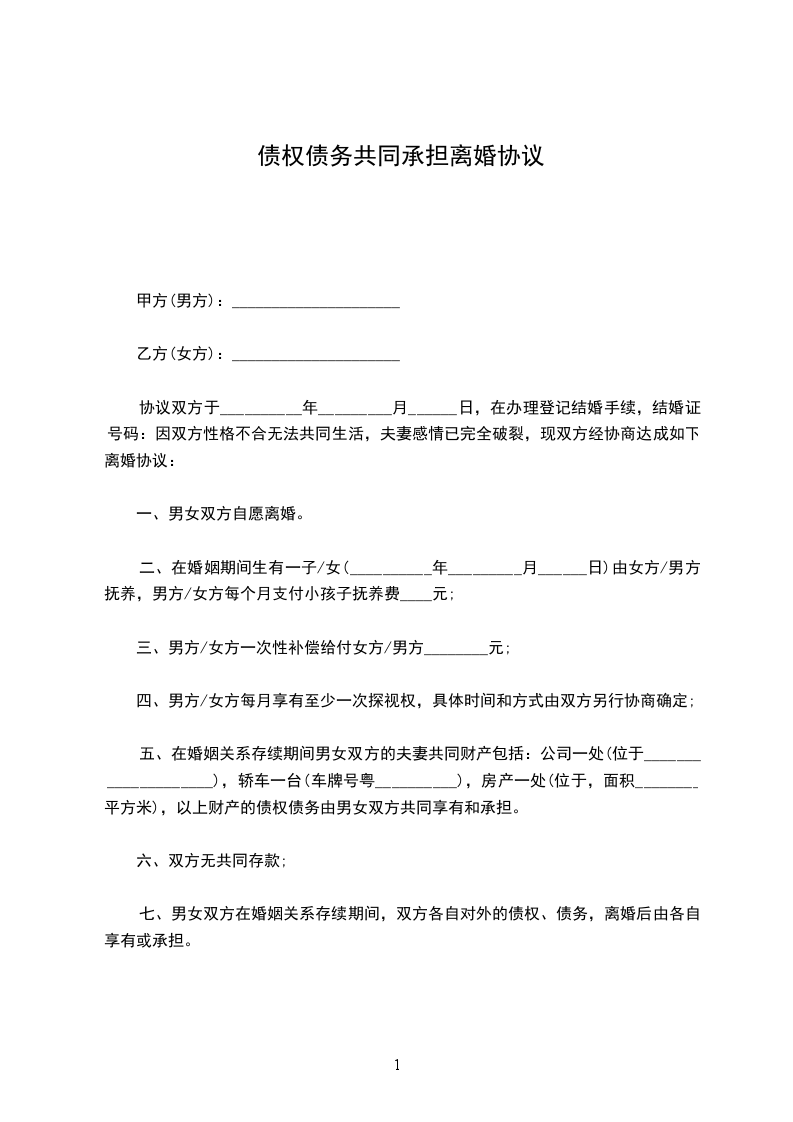 五、在婚姻关系存续期间男女双方的夫妻共同财产包括:公司一处(位于____________________),轿车一台(车牌号粤__________),房产一处(位于,面积________平方米),以上财产的债权债务由男女双方共同享有和承担。
