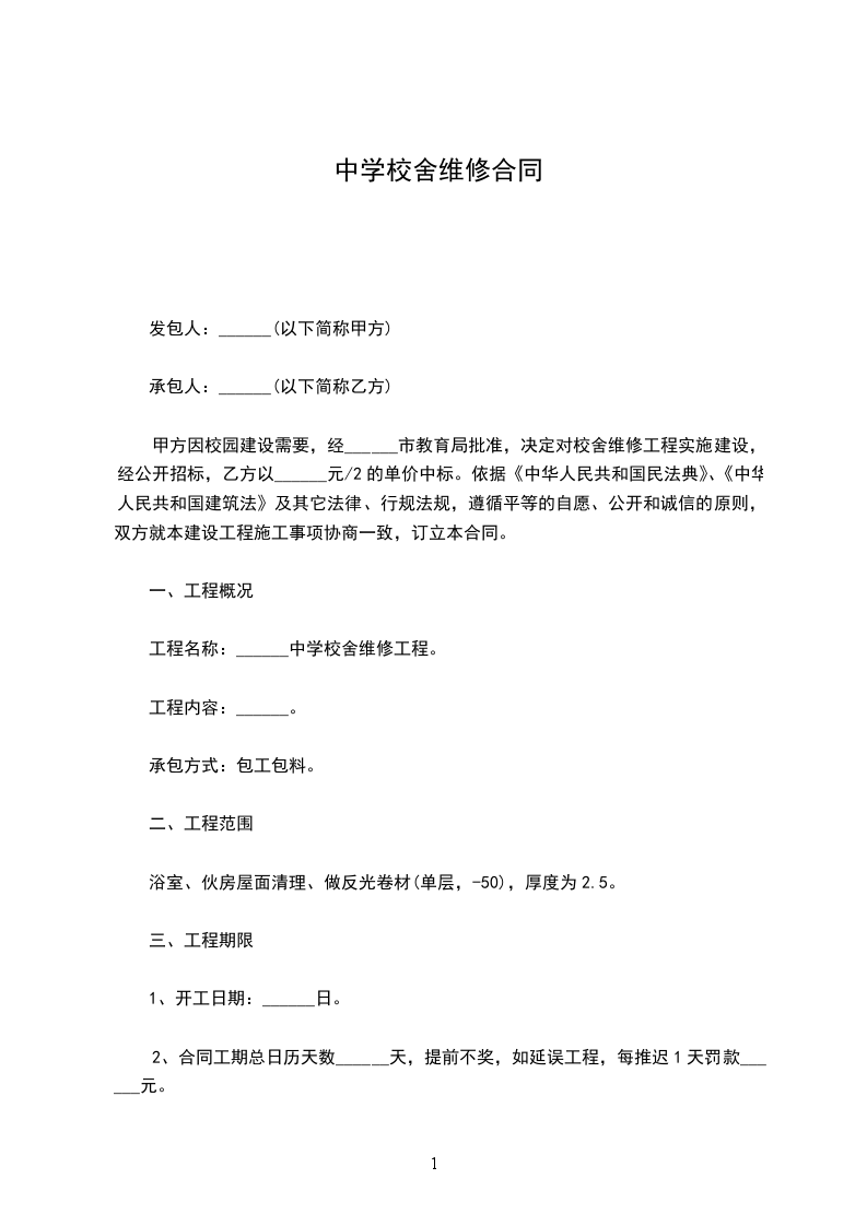 甲方因校园建设需要,经______市教育局批准,决定对校舍维修工程实施建设,经公开招标,乙方以______元/2的单价中标。依据《中华人民共和国民法典》、《中华人民共和国建筑法》及其它法律、行规法规,遵循平等的自愿、公开和诚信的原则,双方就本建设工程施工事项协商一致,订立本合同。